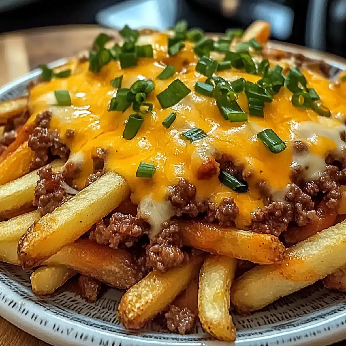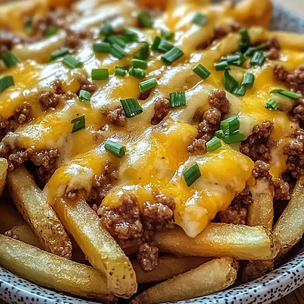 Herzhafter Genuss: Die Kombination aus knusprigen Pommes, würzigem Hackfleisch und geschmolzenem Cheddar schafft einen unvergleichlichen Geschmack, der begeistert.