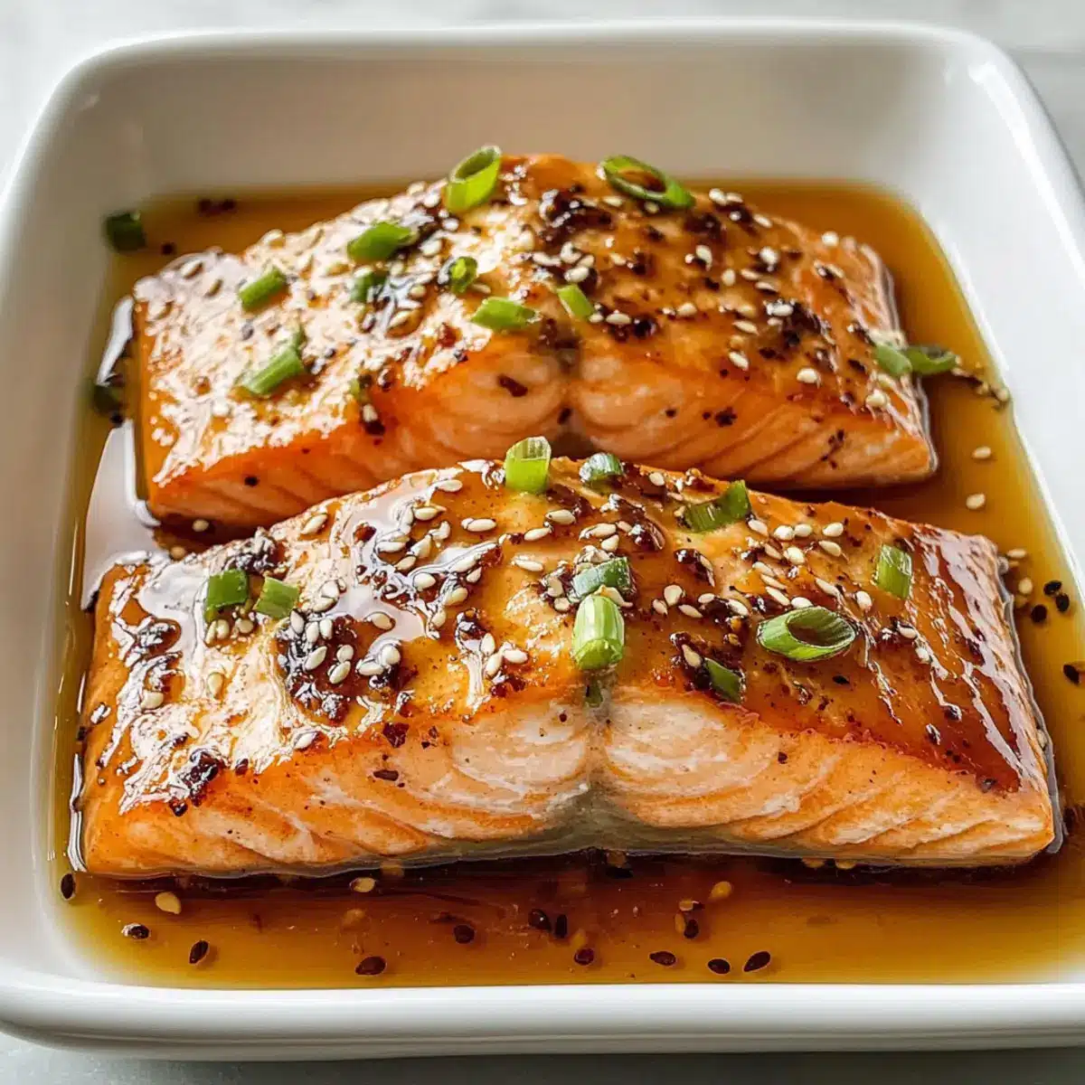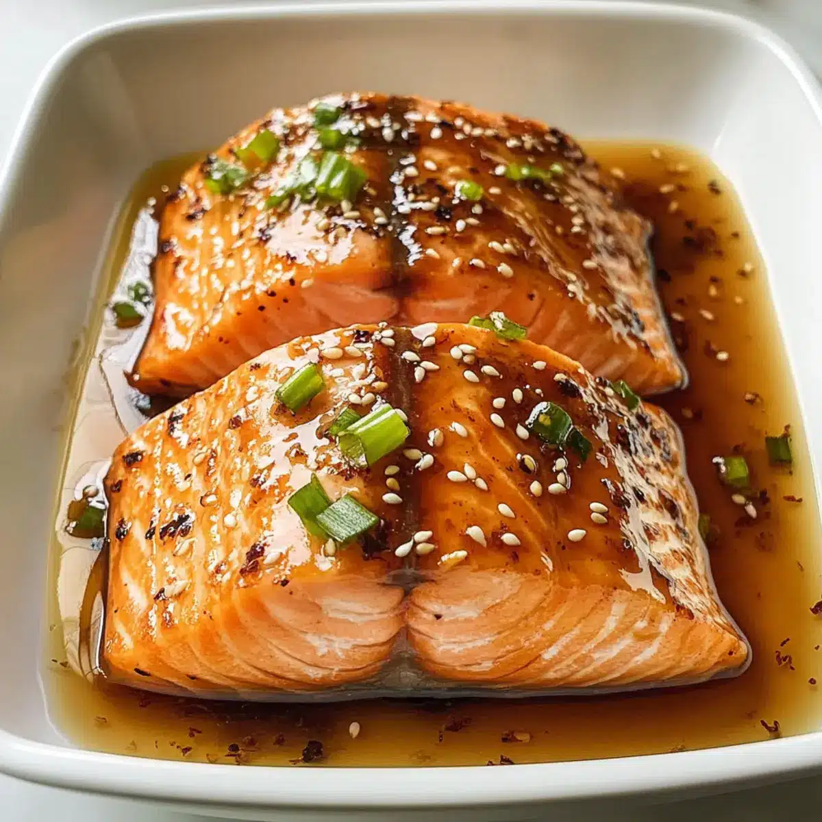 - Den Lachs sofort servieren, damit die Glasur glänzend und warm bleibt. Garnieren nach Belieben mit gerösteten Sesamsamen und gehackten Frühlingszwiebeln.