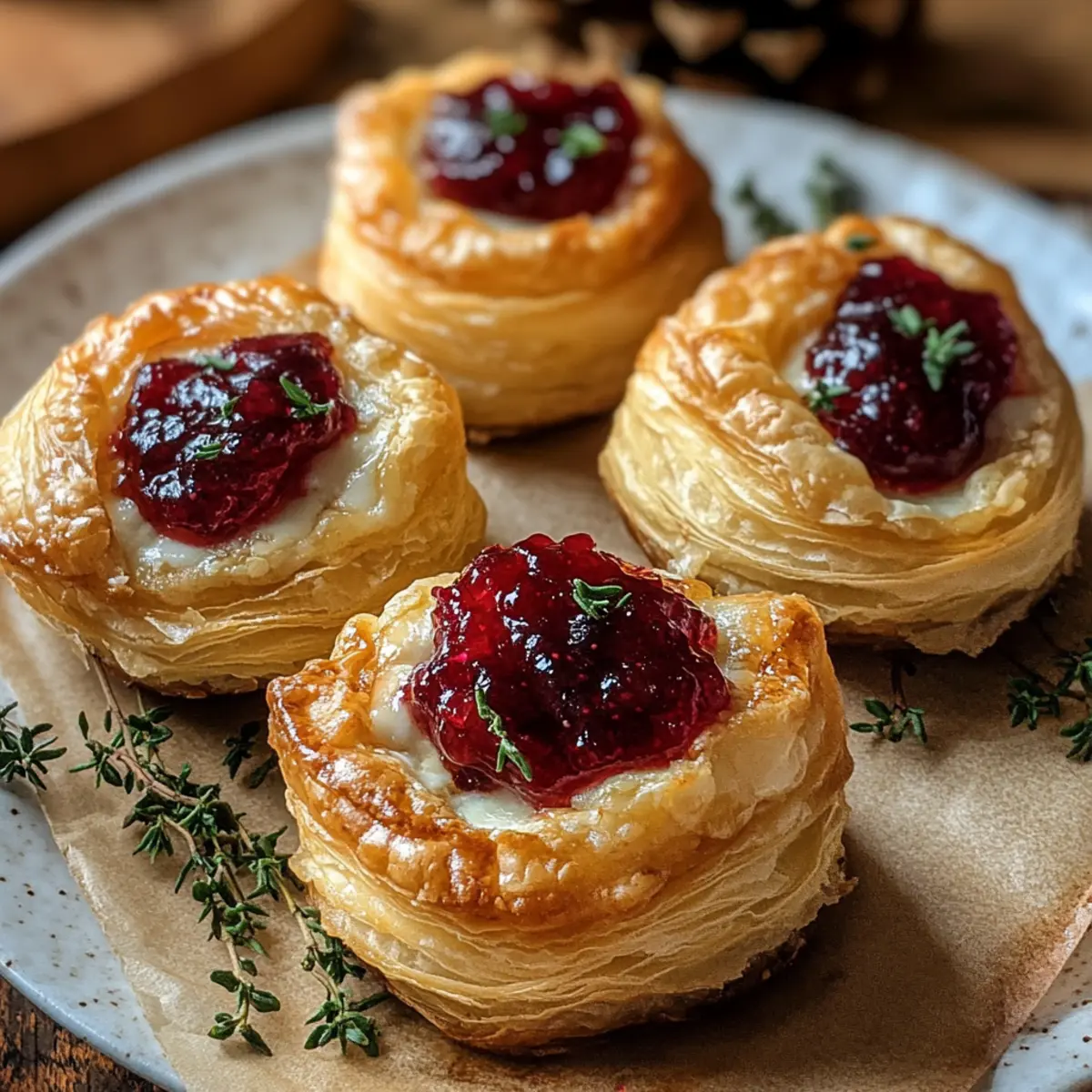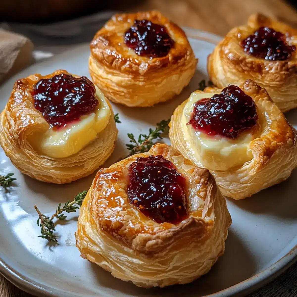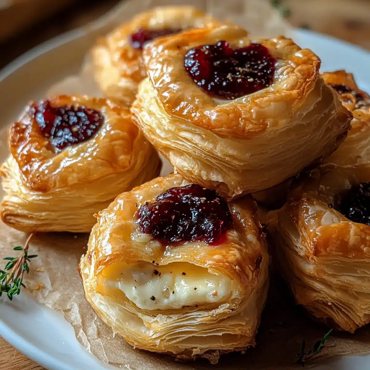 - Legen Sie in die Mitte jedes Teigquadrats ein Stück Camembert und einen Teelöffel Cranberry-Marmelade.