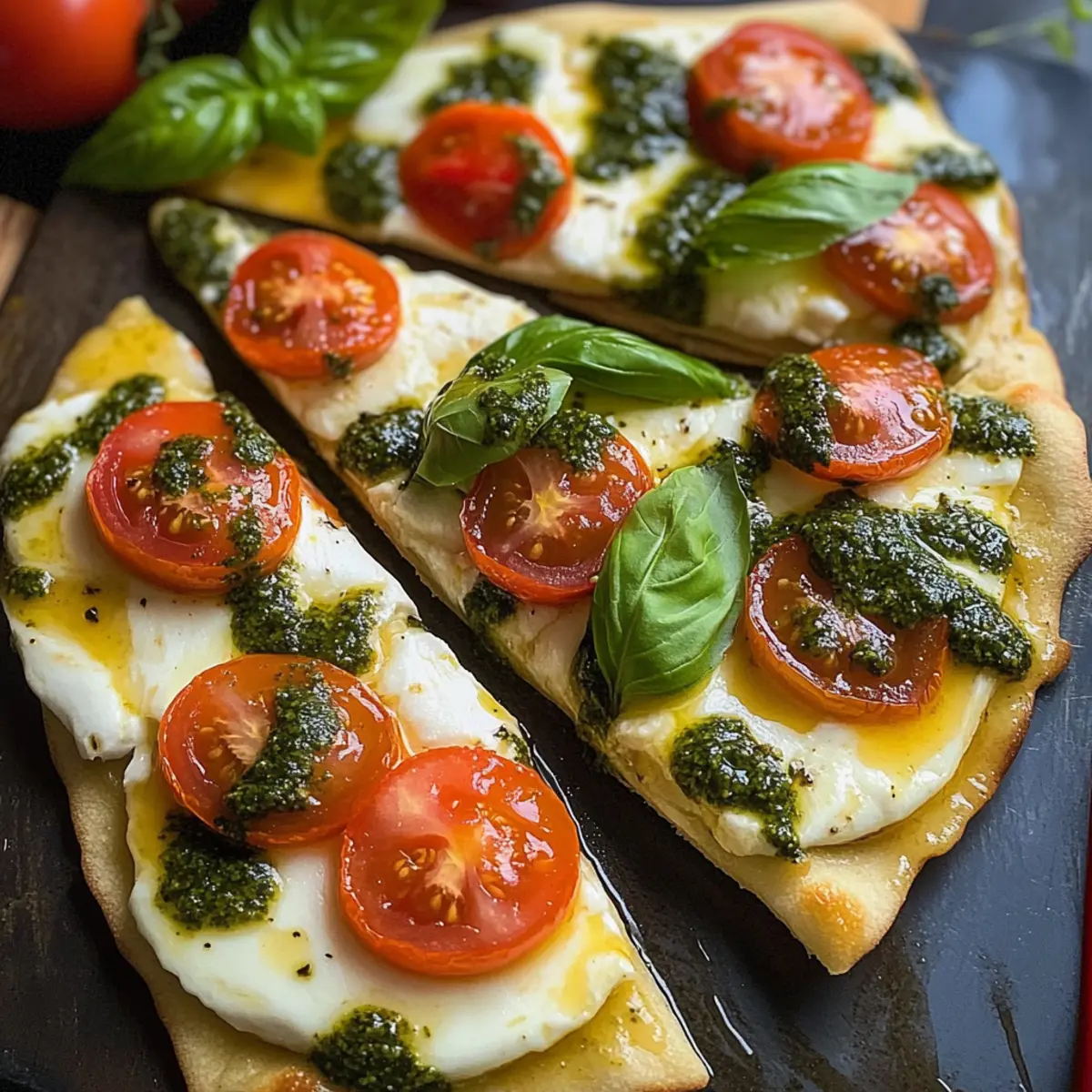 Fladenbrot Caprese mit Basilikum-Vinaigrette genießen