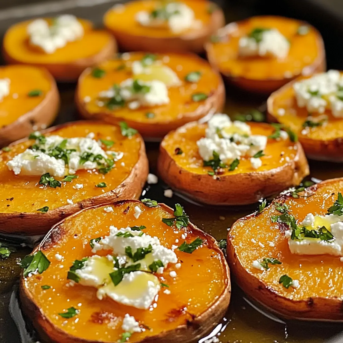 Geröstete Süßkartoffelrunden mit Honig und Feta liebevoll zubereitet