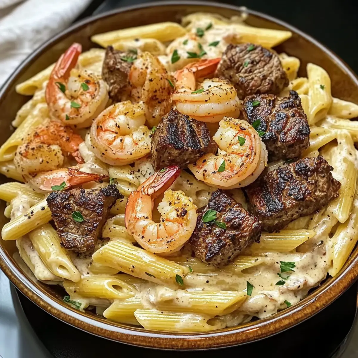 Schwarzes Steak und Garnelen Alfredo Rezept, ein Genuss