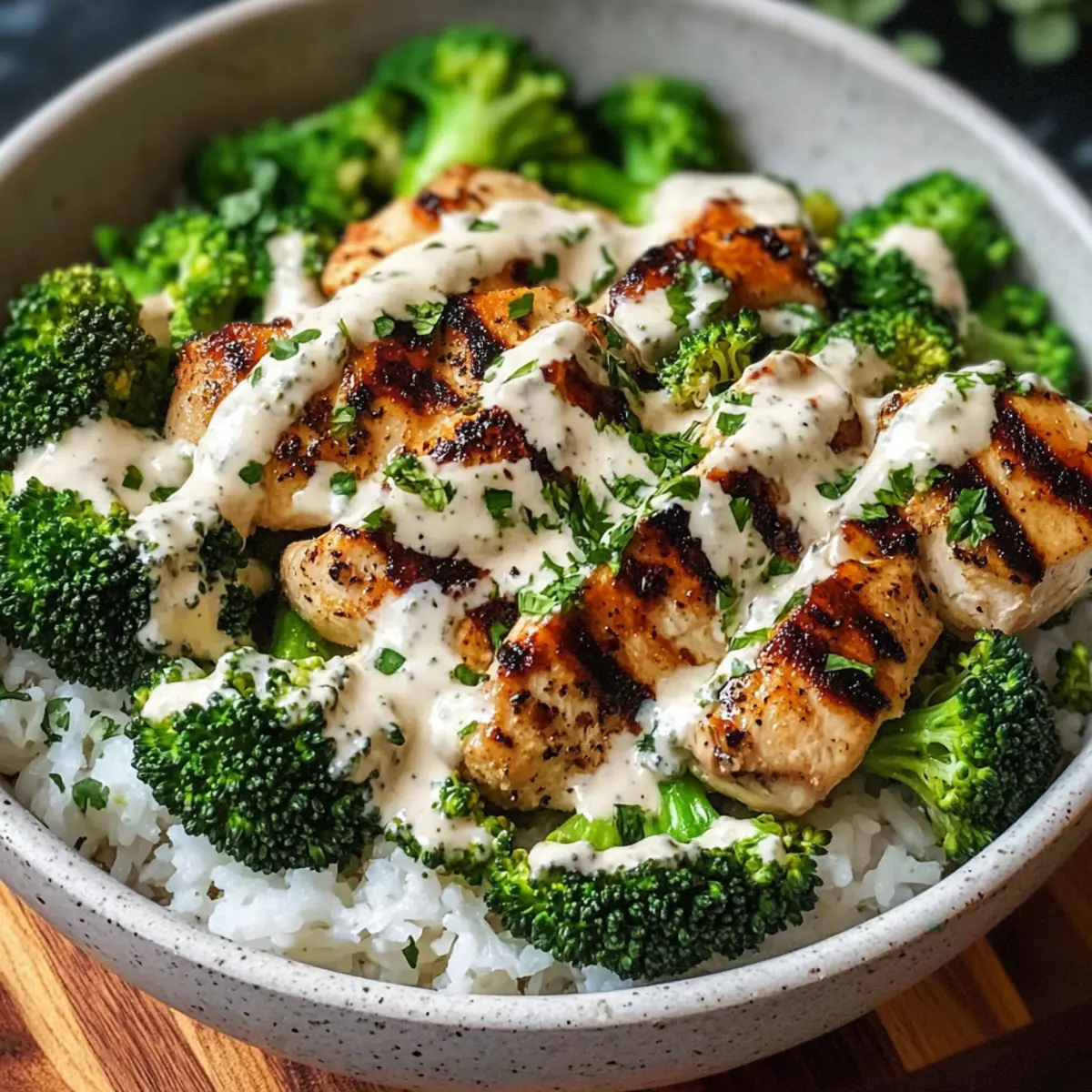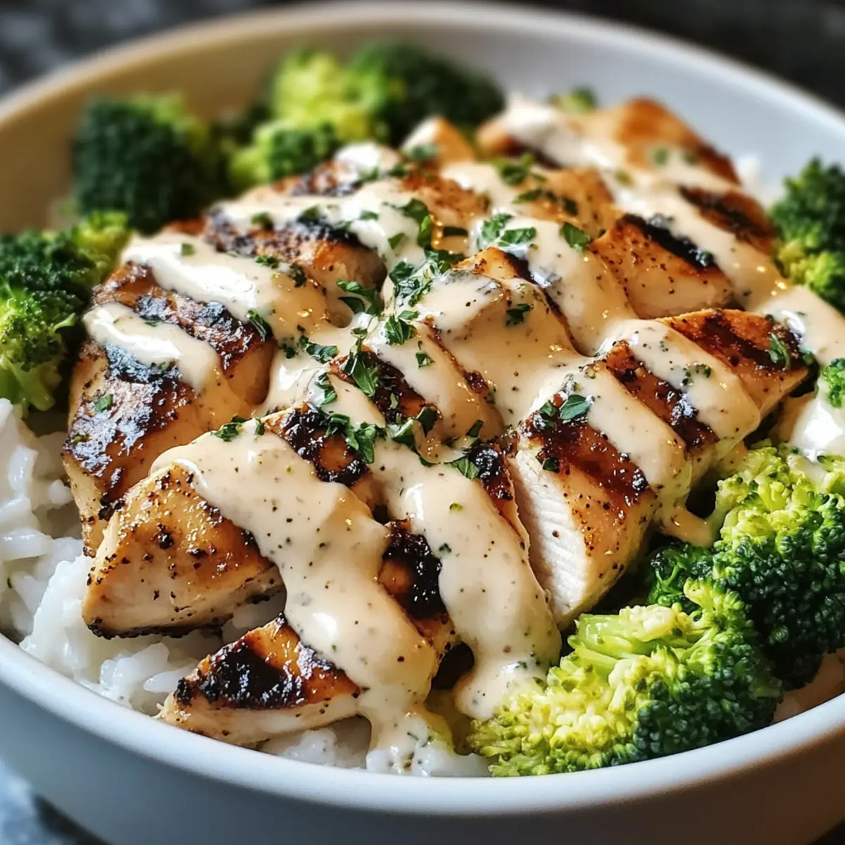 Gegrillte Hähnchen- und Brokkoli-Schalen mit cremiger Knoblauchsoße