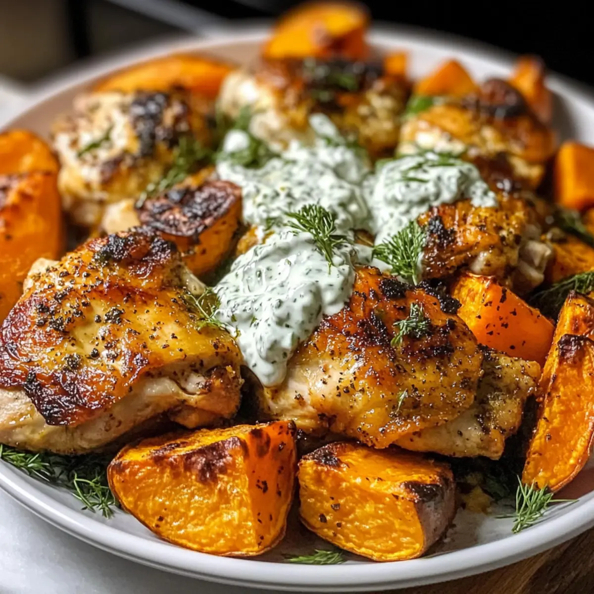 Blechpfanne Hähnchen Tzatziki und Süßkartoffeln genießen
