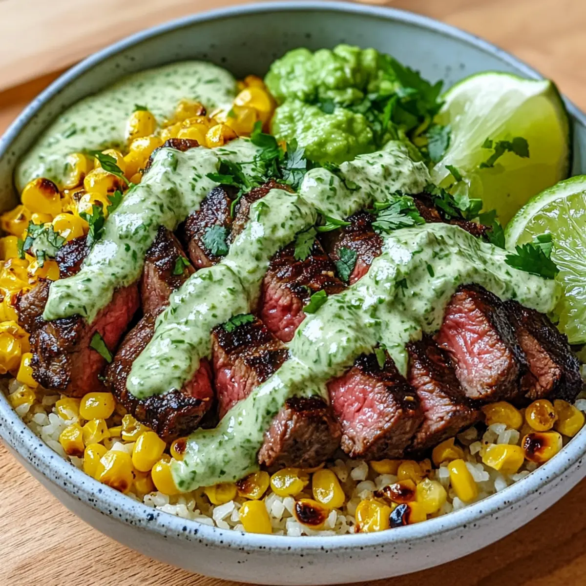 Steak Avocado Gerösteter Mais Schüssel mit Koriandersauce