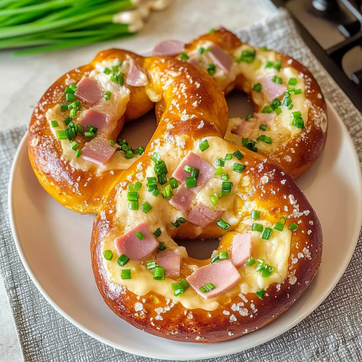 Überbackene Brezeln mit Schinken und Käse schnell gemacht