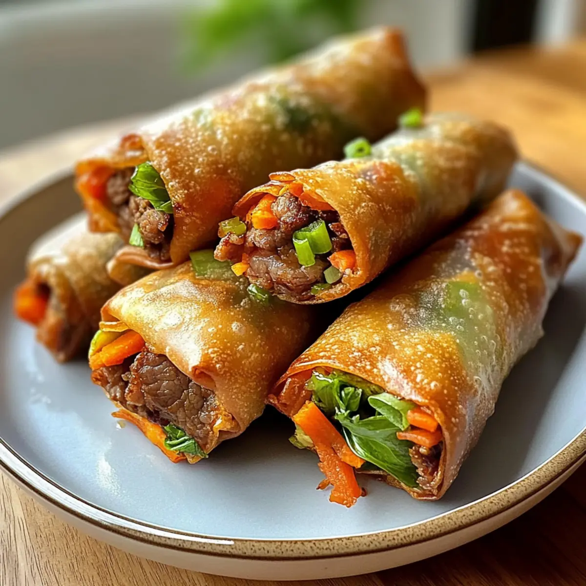 Diese Crispy Frühlingsrollen sind perfekt für Meal Prep und helfen dir, Stress an hektischen Abenden abzubauen! Du kannst die Füllung bis zu 24 Stunden im Voraus vorbereiten – simply brate das Rinderhackfleisch mit den Gemüsezutaten und lasse es vollständig abkühlen, bevor du es in einem luftdichten Behälter im Kühlschrank aufbewahrst. Die Frühlingsrollenteigblätter können ebenfalls vorbereitet und in Frischhaltefolie gewickelt werden, um Austrocknung zu vermeiden. Wenn du bereit bist, sie zu servieren, rolle die gefüllten Frühlingsrollen einfach auf und gare sie in deinem Airfryer für 10-12 Minuten bei 180°C. Achte darauf, die Füllung kühl zu halten, um die Frische und den Geschmack zu bewahren, sodass du auch beim Vorbereiten der Crispy Frühlingsrollen nichts von der knusprigen Delikatesse einbüßt!