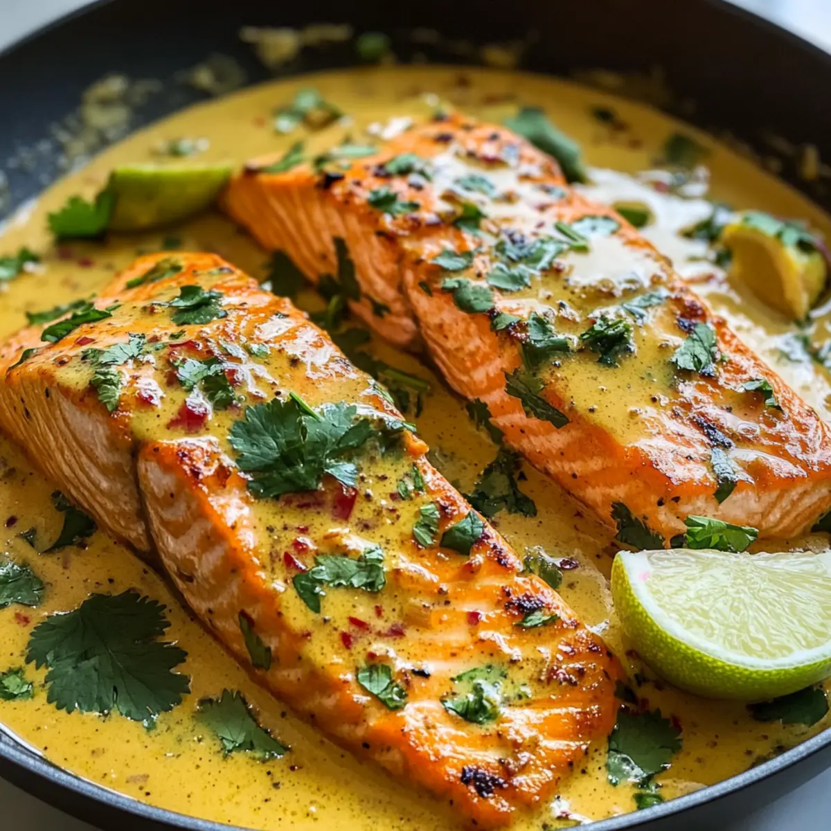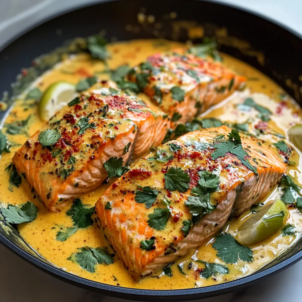 Genießt dieses Ein-Pfannen-Kokosnuss-Curry-Lachs mit Knoblauchbutter Rezept und lasst euch von den Aromen verführen!