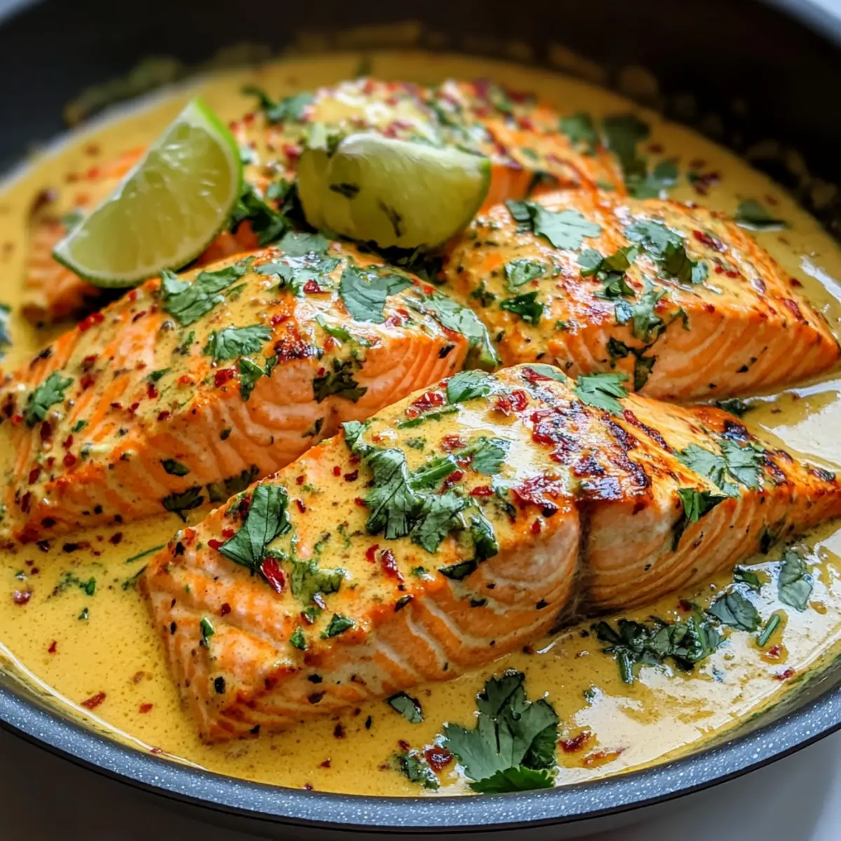 - Hitze reduzieren und den Lachs 5-7 Minuten sanft köcheln lassen. Vor dem Servieren Limettensaft darüber träufeln und mit Koriander oder Basilikum garnieren.