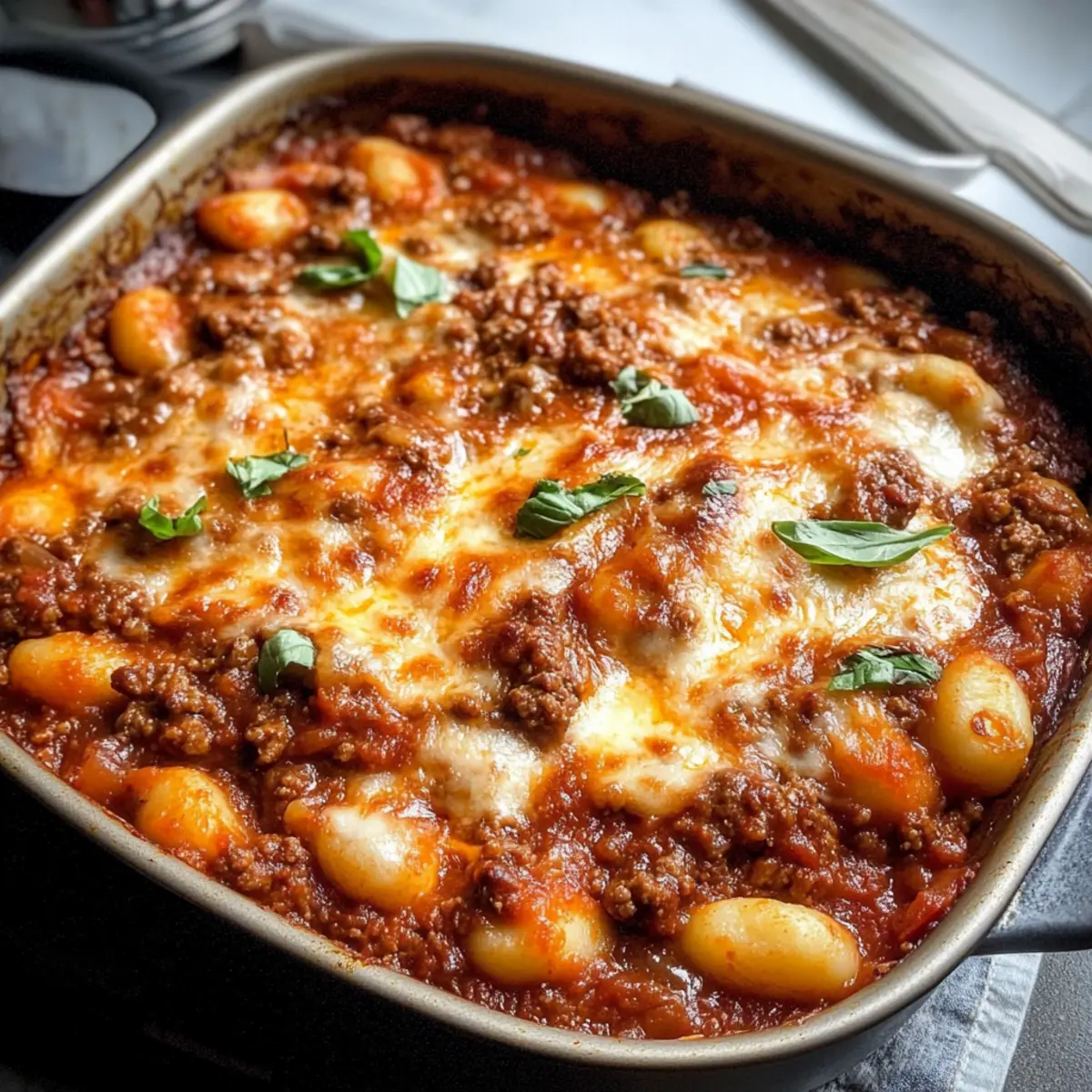 Herzhafter Genuss: Diese Lasagne bietet die perfekte Kombination aus zartem Gnocchi, würzigem Hackfleisch und geschmolzenem Käse, die das Herz jeder Familie höherschlagen lässt.