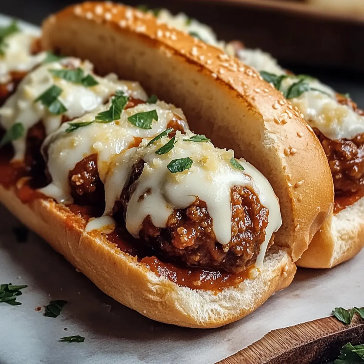 Nimm die fertigen Sandwiches aus dem Ofen und garniere sie optional mit frischer Petersilie für einen farblichen Akzent. Serviere die Fleischbällchen-Sandwiches heiß, direkt auf dem Tisch, um das volle Aroma zu genießen.