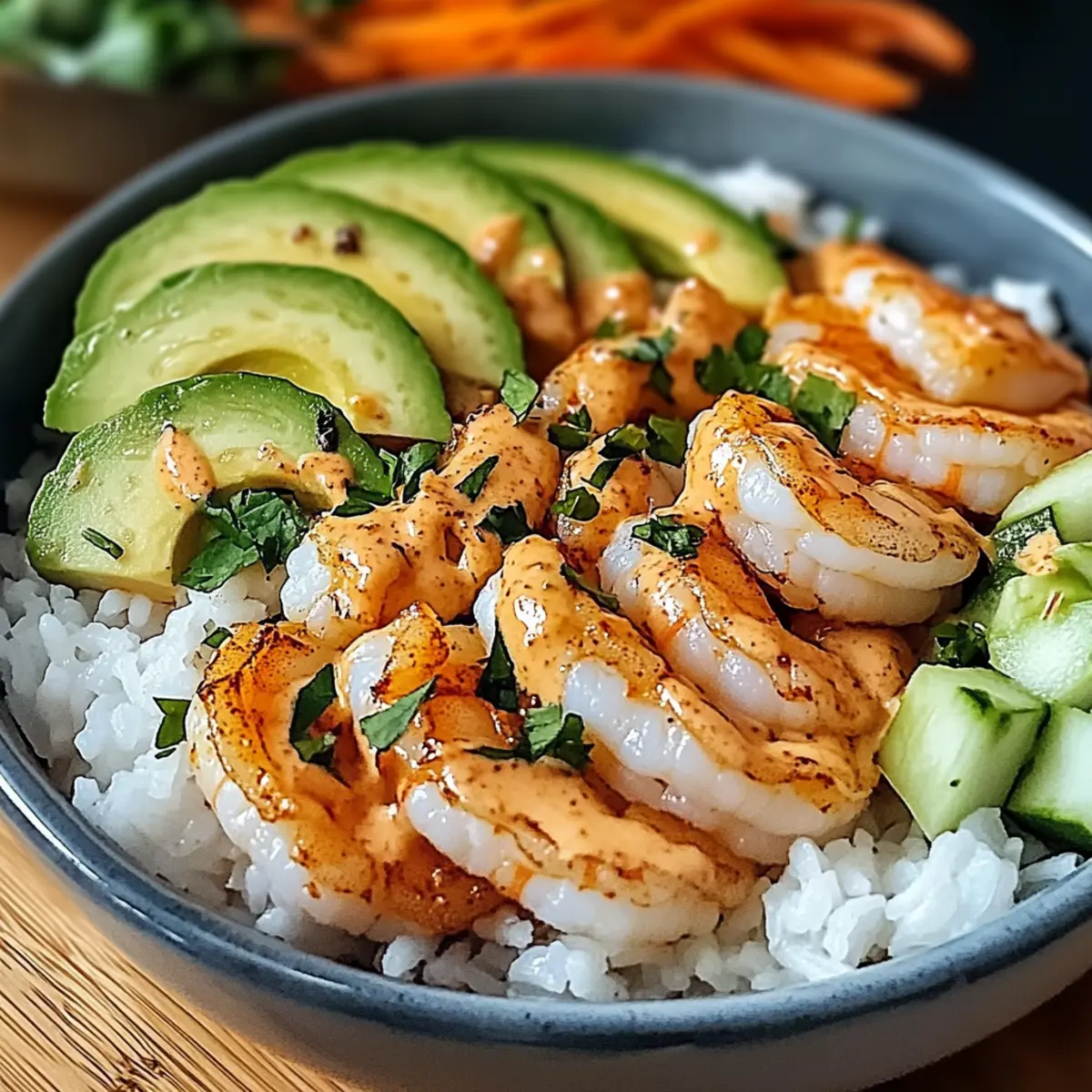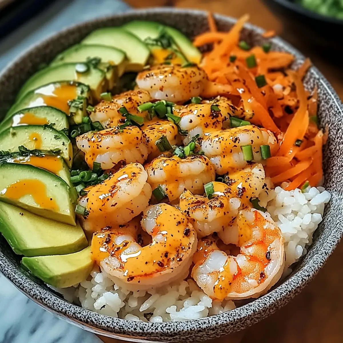 - Bowls zusammenstellen: Fluffigen Reis in Schalen geben, dann Gemüse und Garnelen anrichten, mit der scharfen Mayo garnieren.