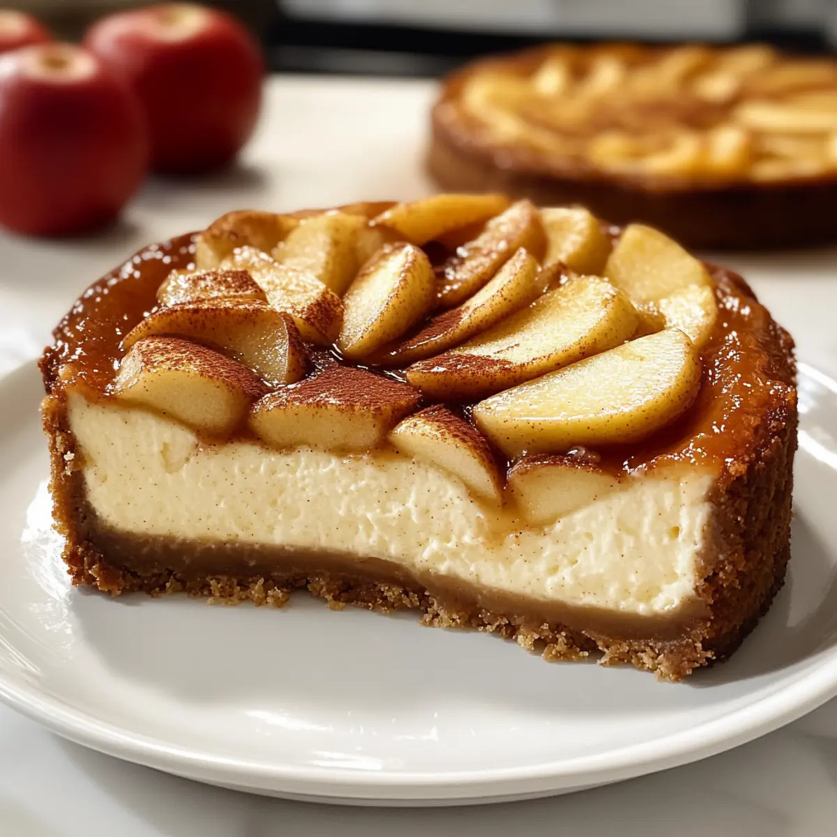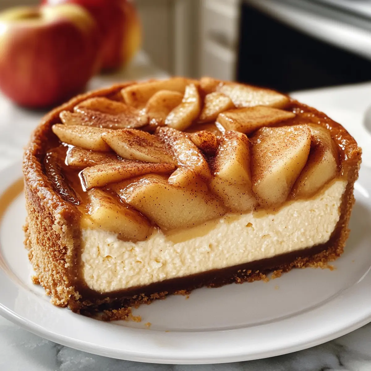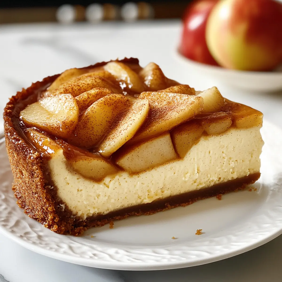 Karamellsauce: Ein Drizzle aus selbstgemachter Karamellsauce ergänzt die karamellisierten Äpfel und verstärkt die süße Note, während die samtige Textur des Käsekuchens erhalten bleibt.