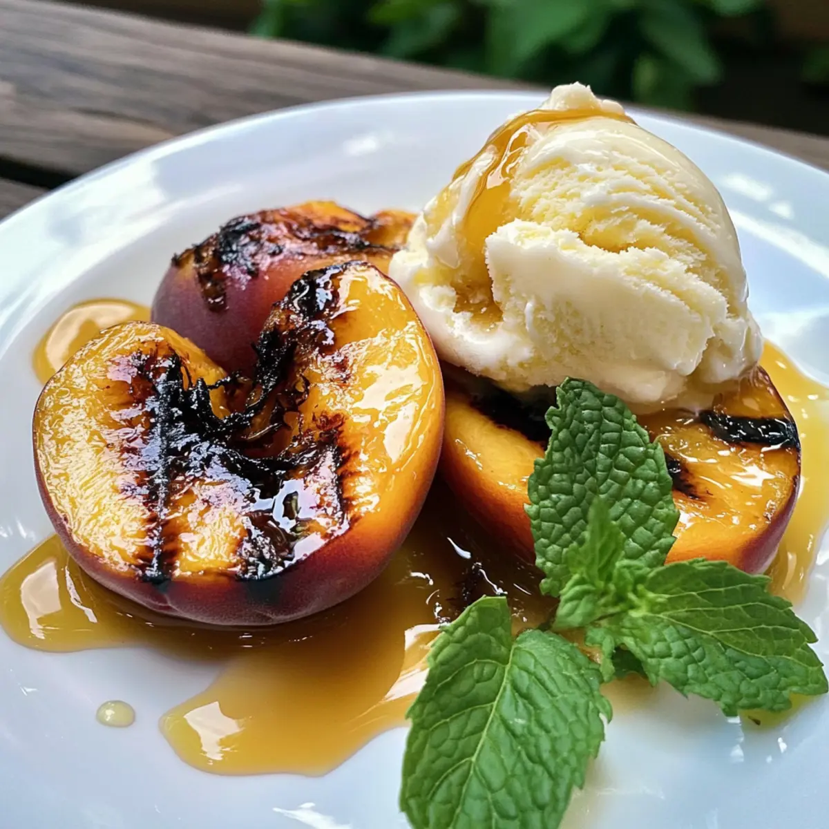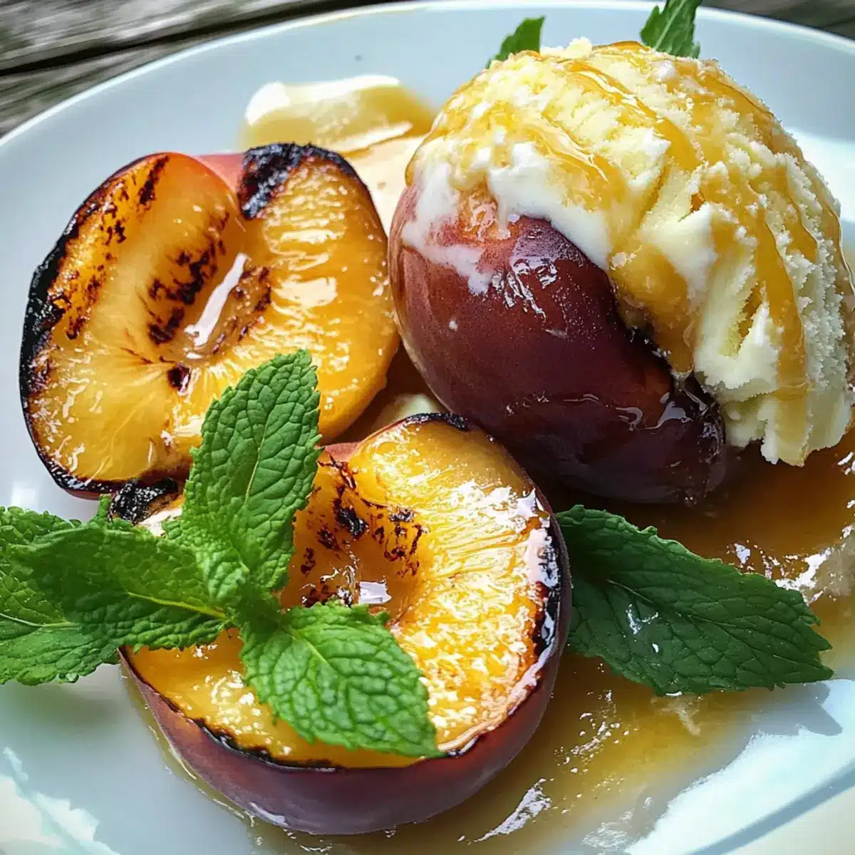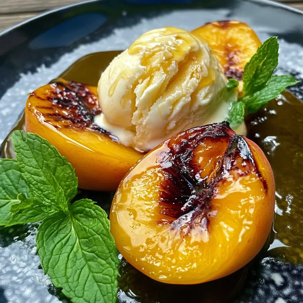 Sommerabende und gegrillte Desserts sind eine unschlagbare Kombination, und die gegrillten Pfirsiche mit Honig und Vanilleeis bieten das perfekte Erlebnis.