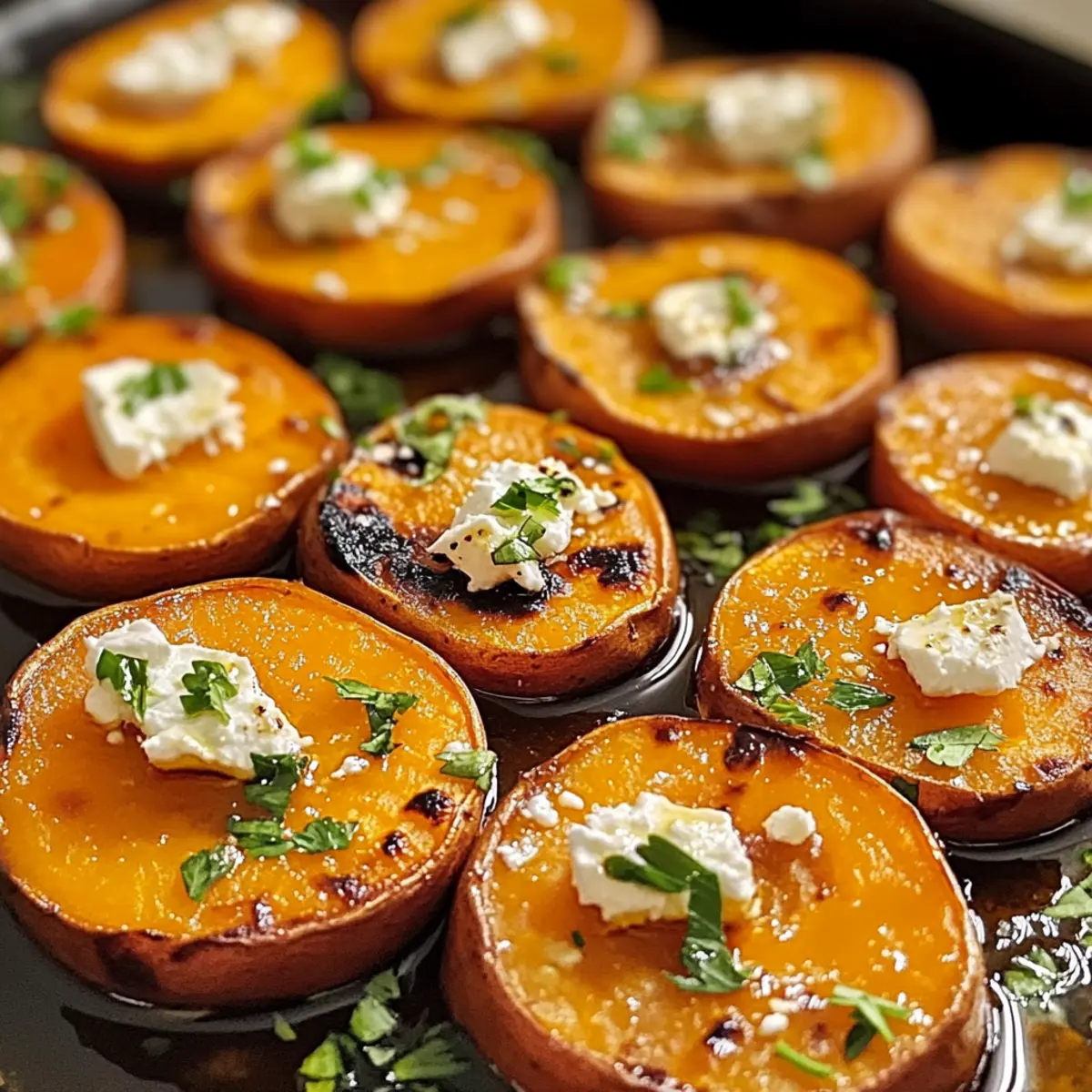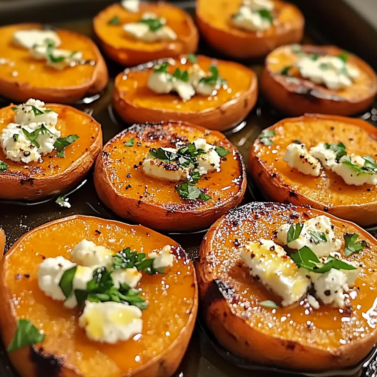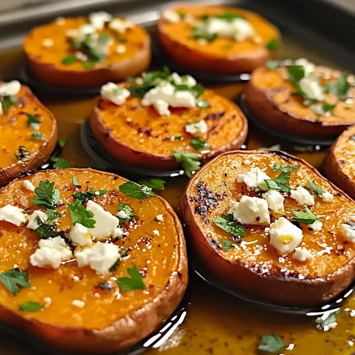 Geröstete Süßkartoffelrunden mit Honig und Feta liebevoll zubereitet