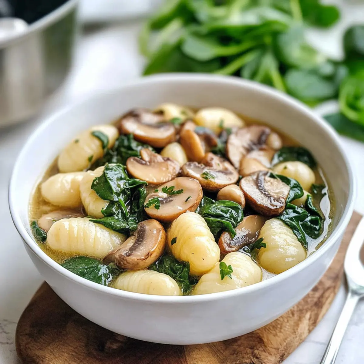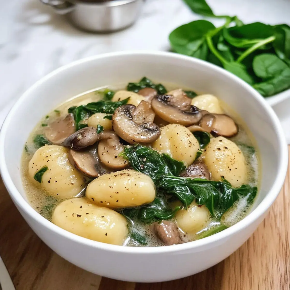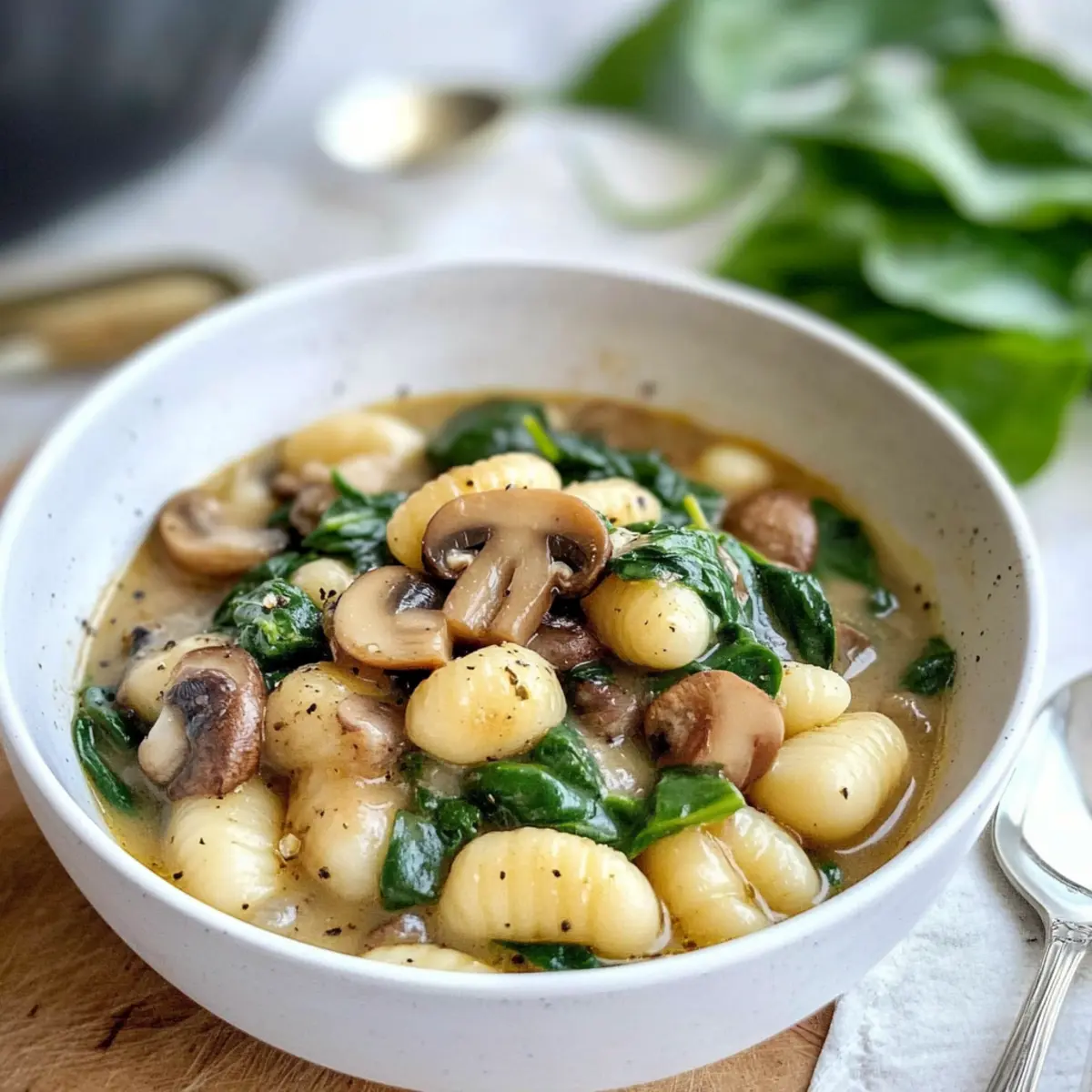 Gnocchi Eintopf mit Spinat und Champignons schnell zubereitet