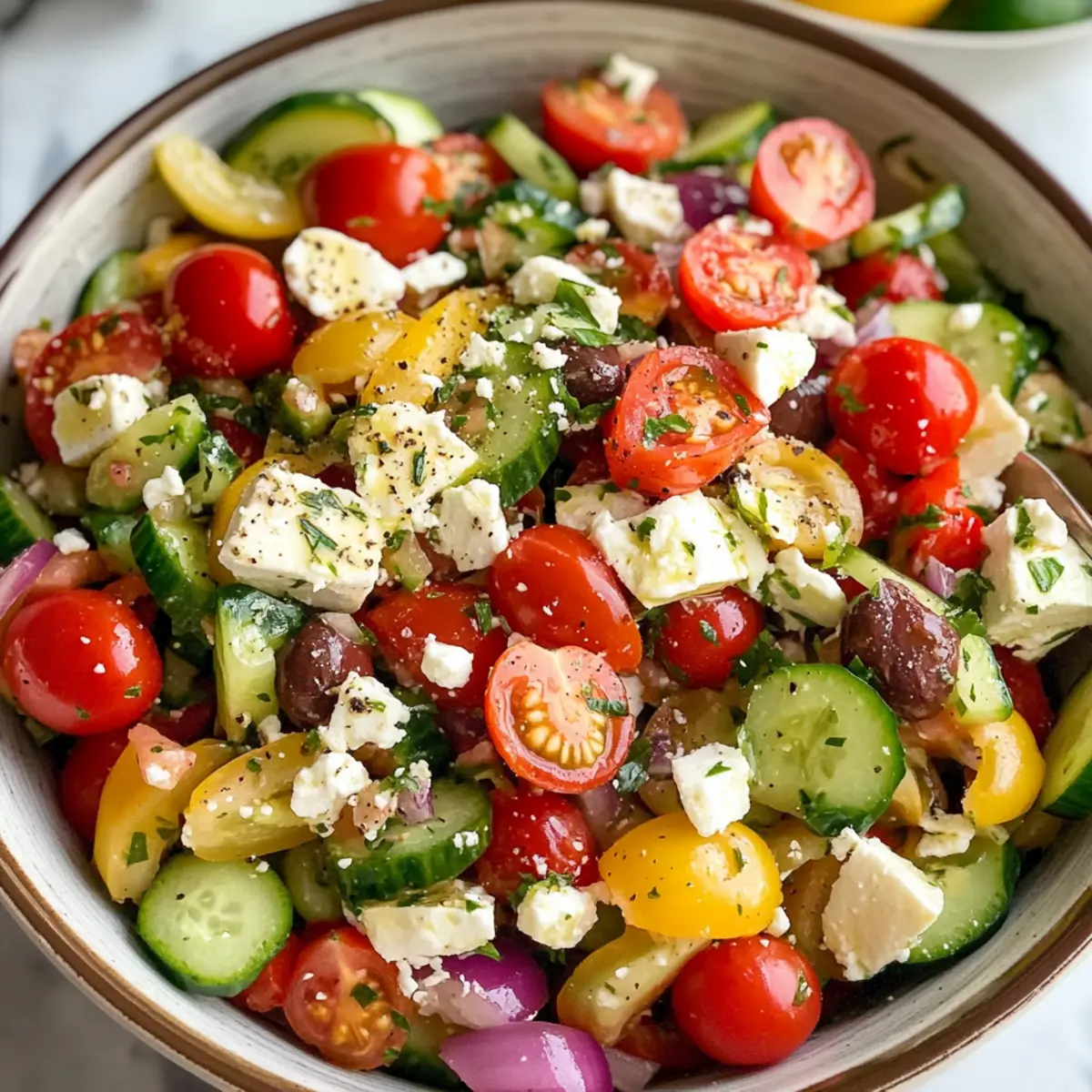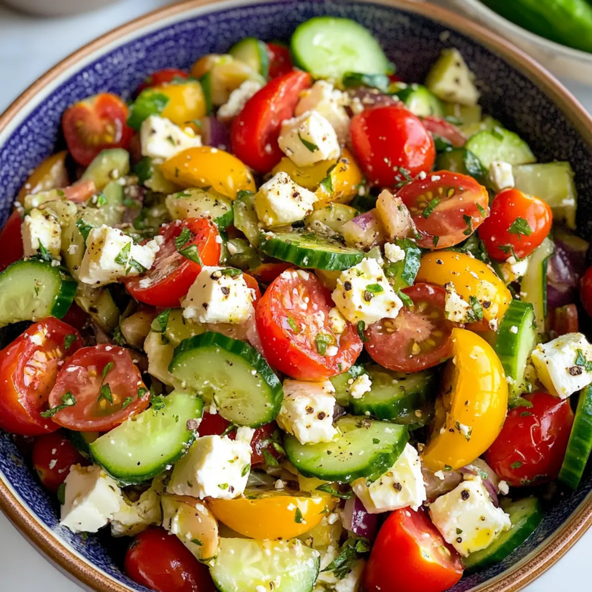 Achten Sie darauf, frisches Gemüse zu wählen. Gurken sollten knackig und ohne dunkle Flecken sein. Kirschtomaten sollten leuchtend rot und fest sein. Feta-Käse sollte cremig sein und einen vollen Geschmack haben – ich empfehle, die Marken zu probieren, die in Ihrer Region angeboten werden!