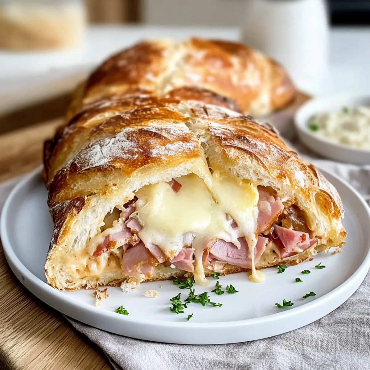 Lasse die Handbrote nach dem Backen ein paar Minuten abkühlen, bevor du sie in Stücke schneidest. Serviere sie warm mit einem Becher Crème fraîche und gehacktem Schnittlauch als dipfiste Beilage. Diese Kombination macht dein Handbrot mit Schinken & Käse zu einem unwiderstehlichen Snack!