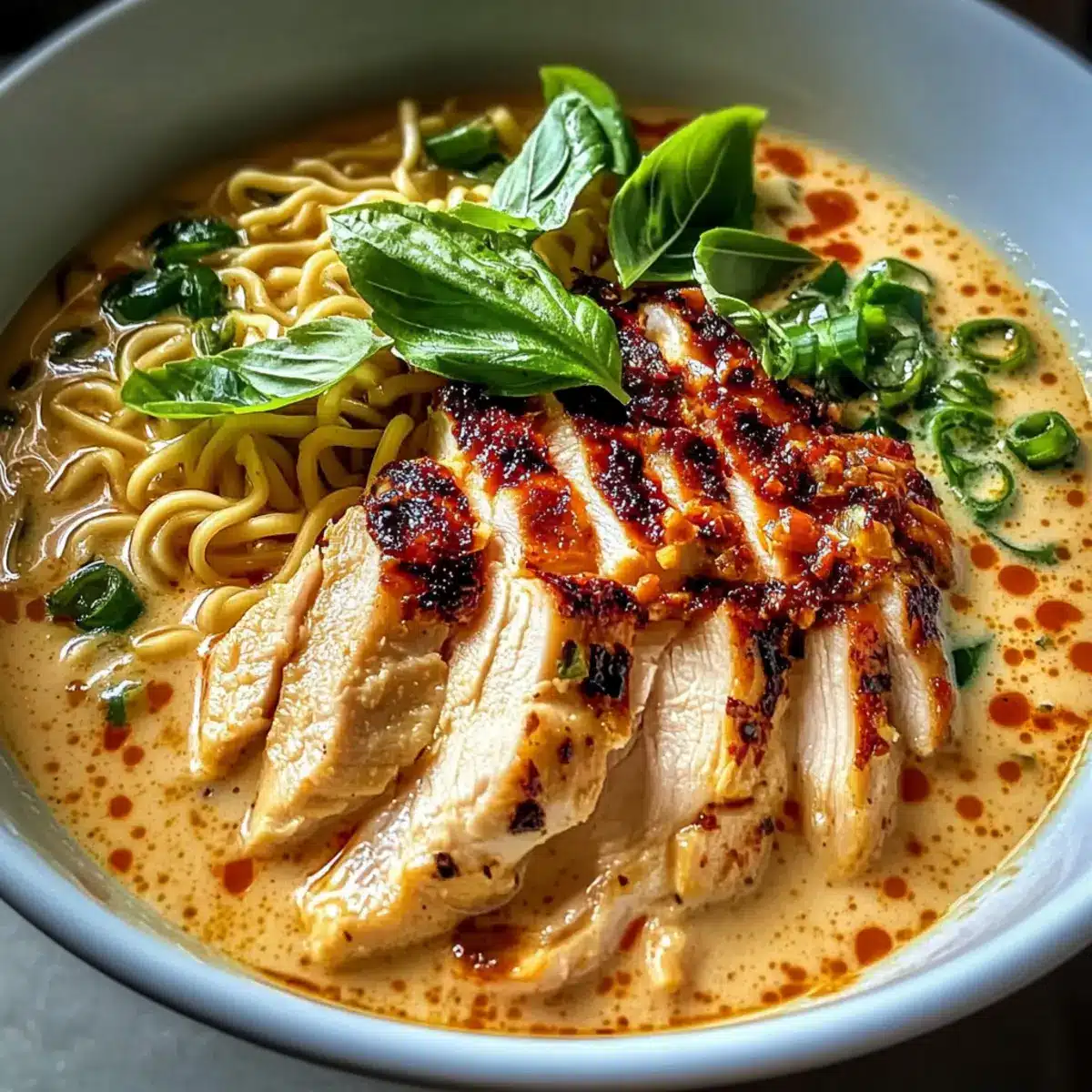 - Den Heirate mich Huhn Ramen heiß anrichten und nach Belieben mit frischem Basilikum garnieren.