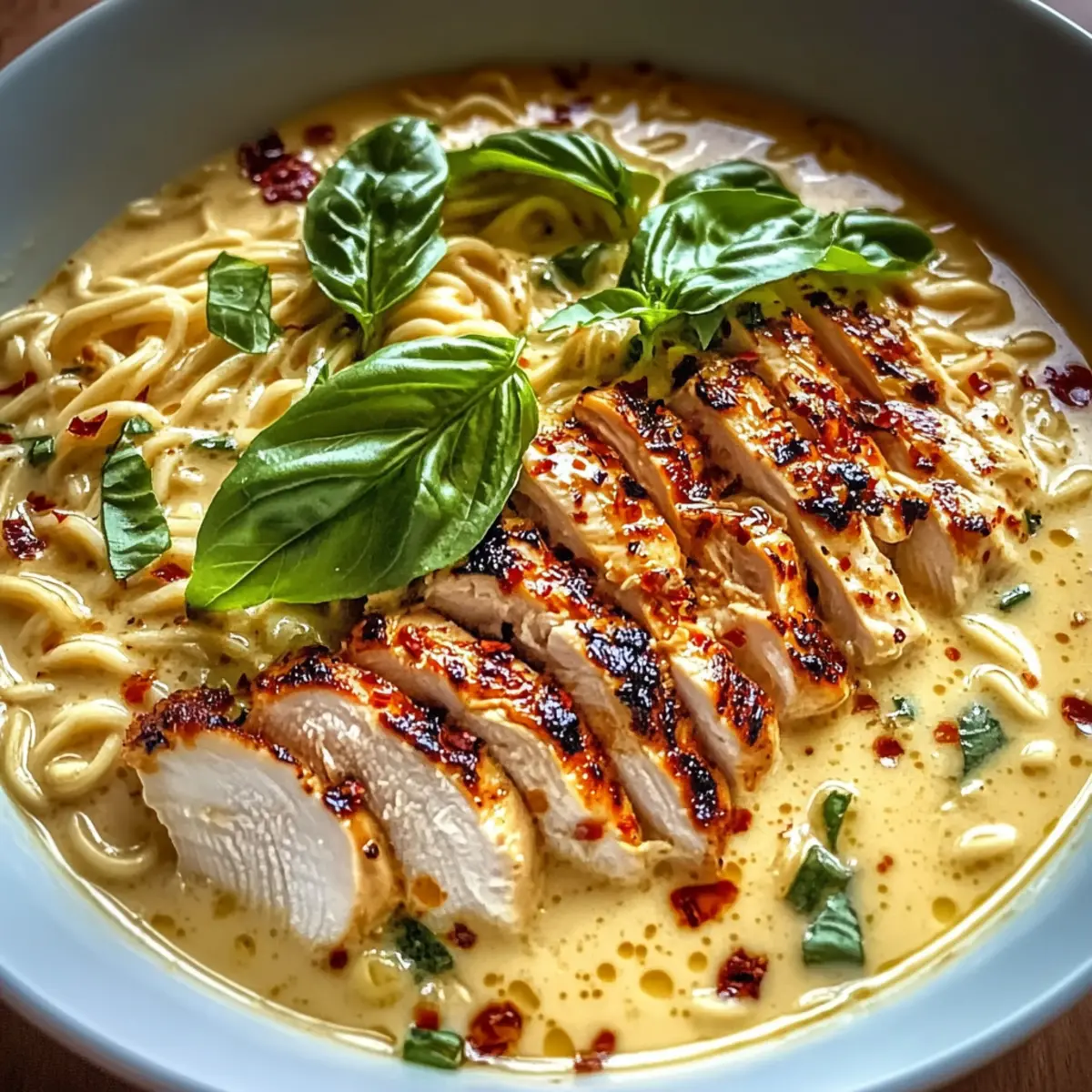 Den Heirate mich Huhn Ramen heiß anrichten und nach Belieben mit frischem Basilikum und zusätzlichem Parmesan garnieren. Diese Mischung aus zartem Hähnchen und cremiger Sauce wird deine Gäste begeistern und sorgt für herzliche Momente am Tisch.