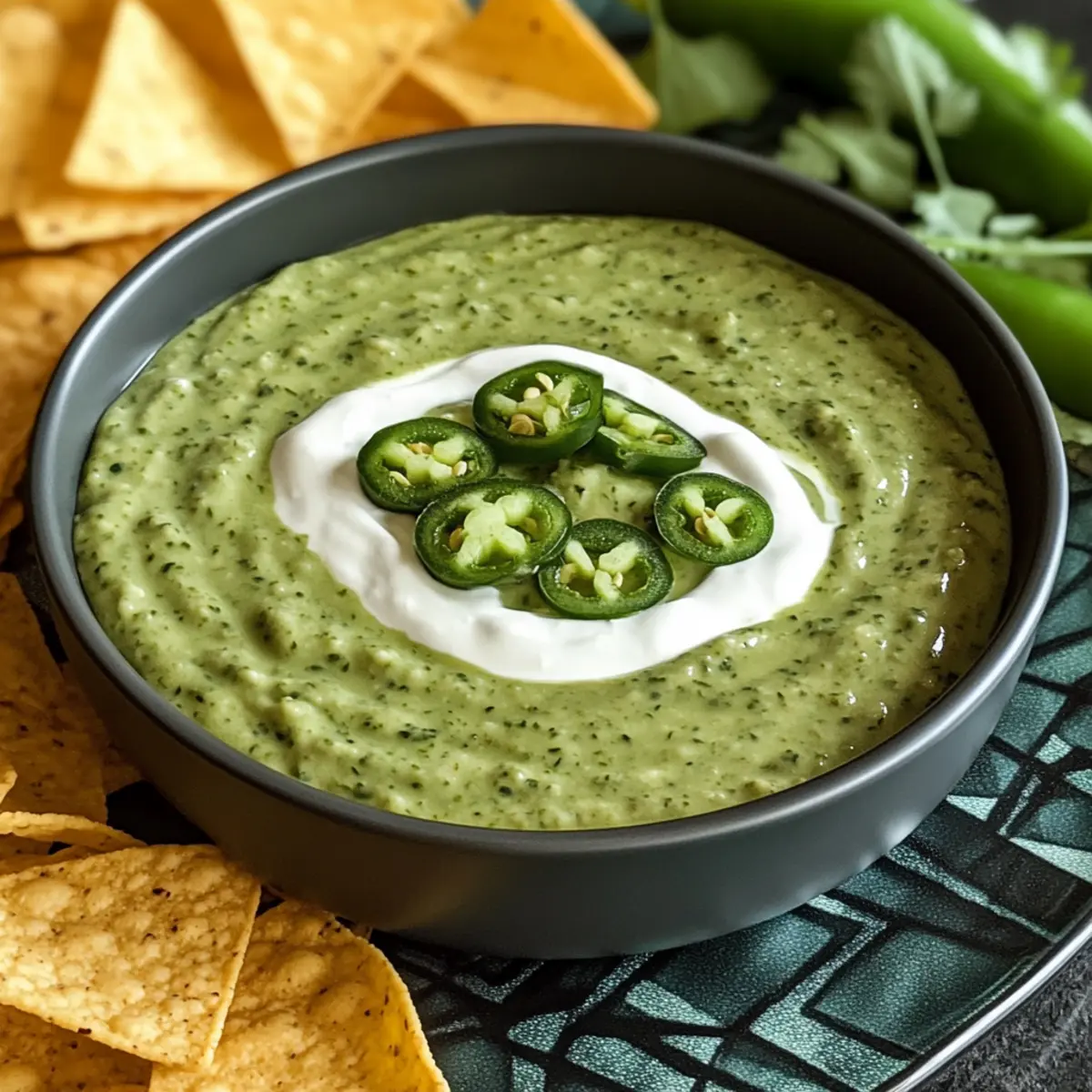 Dieser Hexenbrühe Salsa Verde & Sahnedip wird durch seine einfache Zubereitung und lebendige Präsentation ein Hit auf jeder Halloween-Feier!
