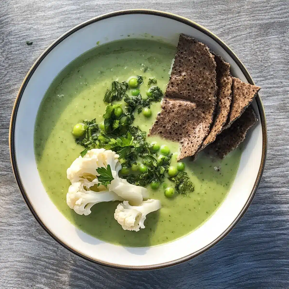 - Nehmt die Erbsensuppe aus dem Kühlschrank, gebt sie in Schalen und vermischt die marinierten Karfiolröschen.
