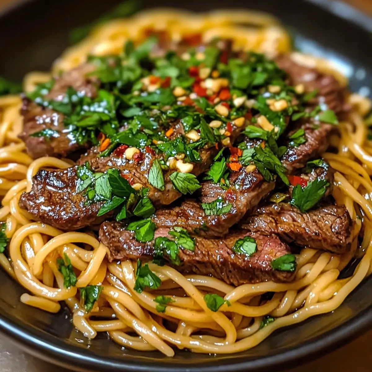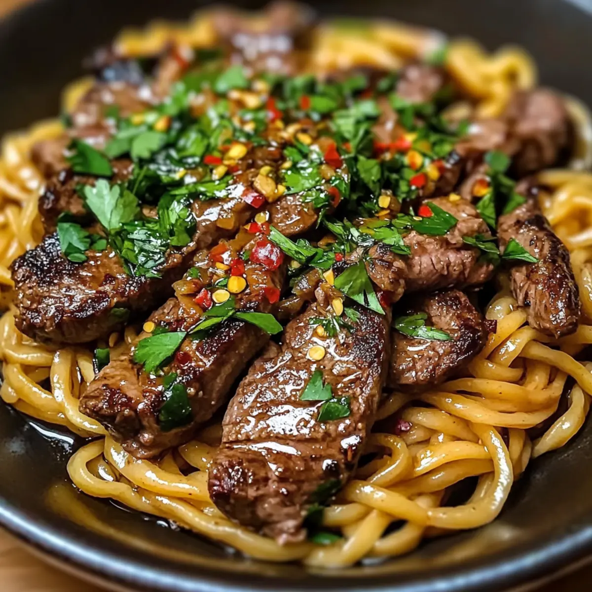 Aromatischer Genuss: Der reichhaltige Geschmack von Knoblauch und Butter umhüllt zarte Nudeln und Steakstücke, ein wahrer Hochgenuss!