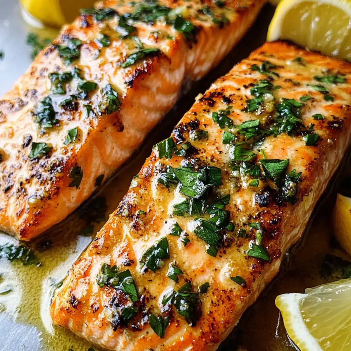 Lege den Lachs zurück in die Pfanne und löffle die Knoblauchbuttersauce großzügig über die Filets. Garniere das Gericht nach Belieben mit frischer Petersilie. Serviere den Knoblauchbutterlachs sofort heiß, idealerweise mit Zitronenschnitzen für zusätzlichen Frischekick.