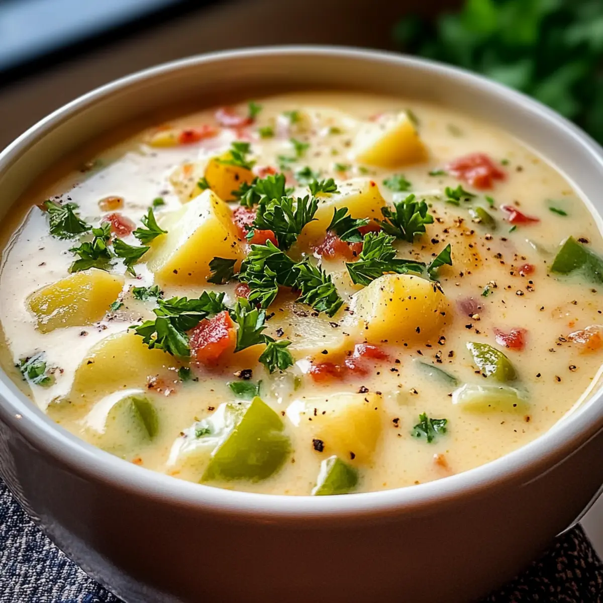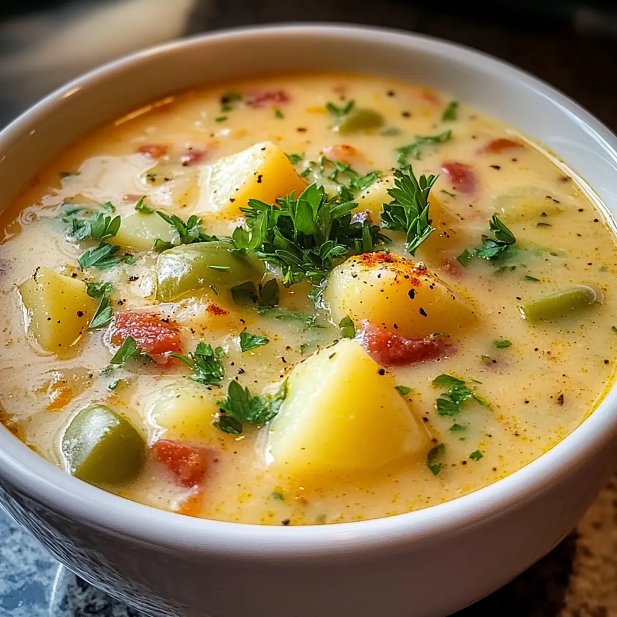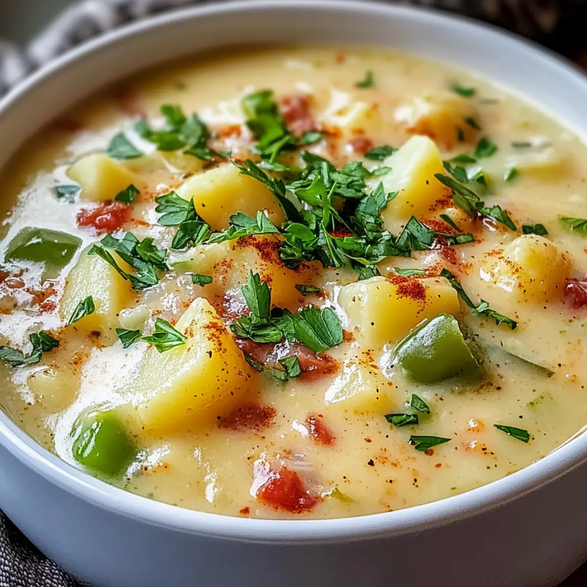 Köstliche Texturen: Die Suppe vereint eine cremige Konsistenz mit dem Biss zarter Kartoffeln und knackigem Gemüse – ein Fest für die Sinne!