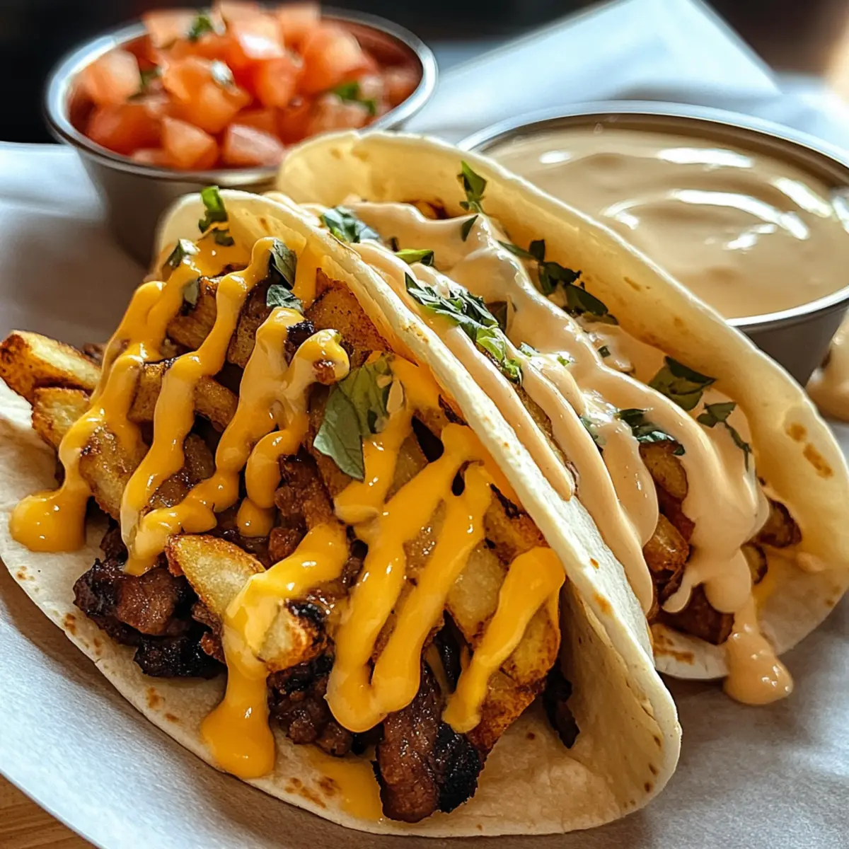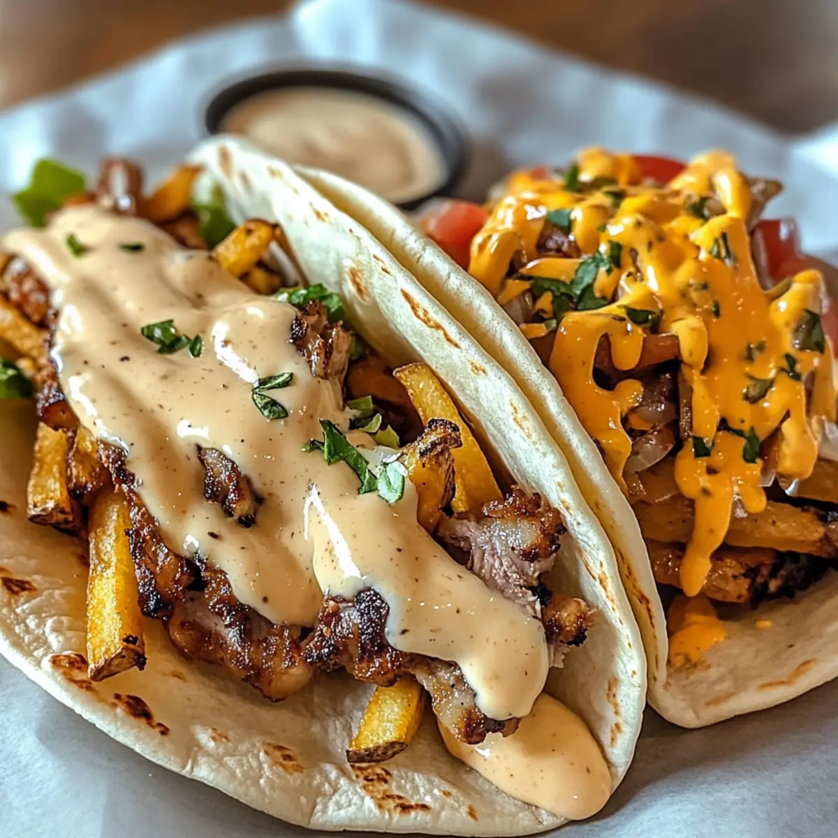 Köstlichkeit und Vielfalt: Diese leckeren Tacos bieten eine unwiderstehliche Kombination aus knusprigen Pommes und leckerer Käsesauce, die jeden Bissen zu einem Genuss machen.