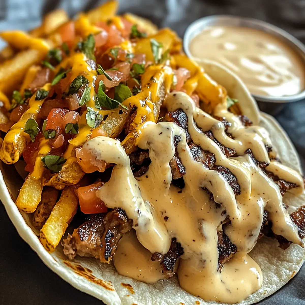 Diese leckeren Tacos sind perfekt für die Meal Prep, da Sie viele Komponenten im Voraus vorbereiten können. Die Käsesauce kann bis zu 3 Tage im Kühlschrank aufbewahrt werden – stellen Sie sicher, dass sie in einem luftdichten Behälter gelagert wird, um die Cremigkeit zu bewahren. Das Fleisch kann bereits am Vortag (bis zu 24 Stunden) angebraten und in einer airtight Verpackung aufbewahrt werden. Wenn Sie bereit sind zu servieren, erwärmen Sie einfach die Käsesauce und das Fleisch, fügen Sie die knusprigen Pommes und frisches Gemüse hinzu und wickeln Sie die Tacos fest, um sicherzustellen, dass sie beim Grillen nicht auseinanderfallen. Mit diesen Vorbereitungen sparen Sie Zeit und genießen trotzdem gastronomische Ergebnisse zu Hause!