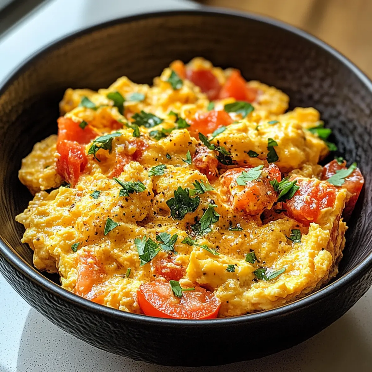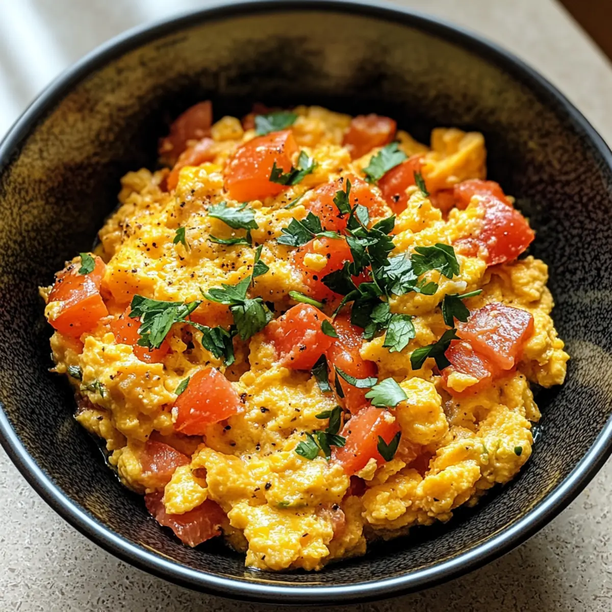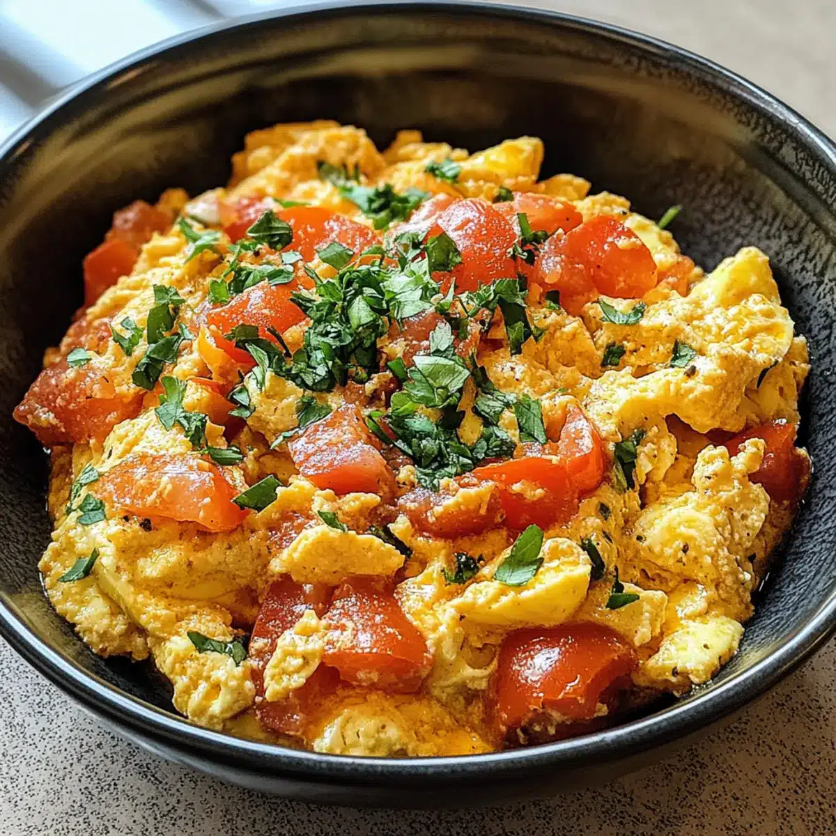 Reduziere die Hitze auf niedrig und schlage 4 Eier in eine Schüssel. Verquirle die Eier leicht und gieße sie dann direkt in die Pfanne über die Tomatenmischung. Rühre alles vorsichtig für etwa 3 bis 4 Minuten, bis die Eier weich gerührt sind. Achte darauf, nicht zu lange zu kochen, damit die Eier cremig bleiben und nicht austrocknen.