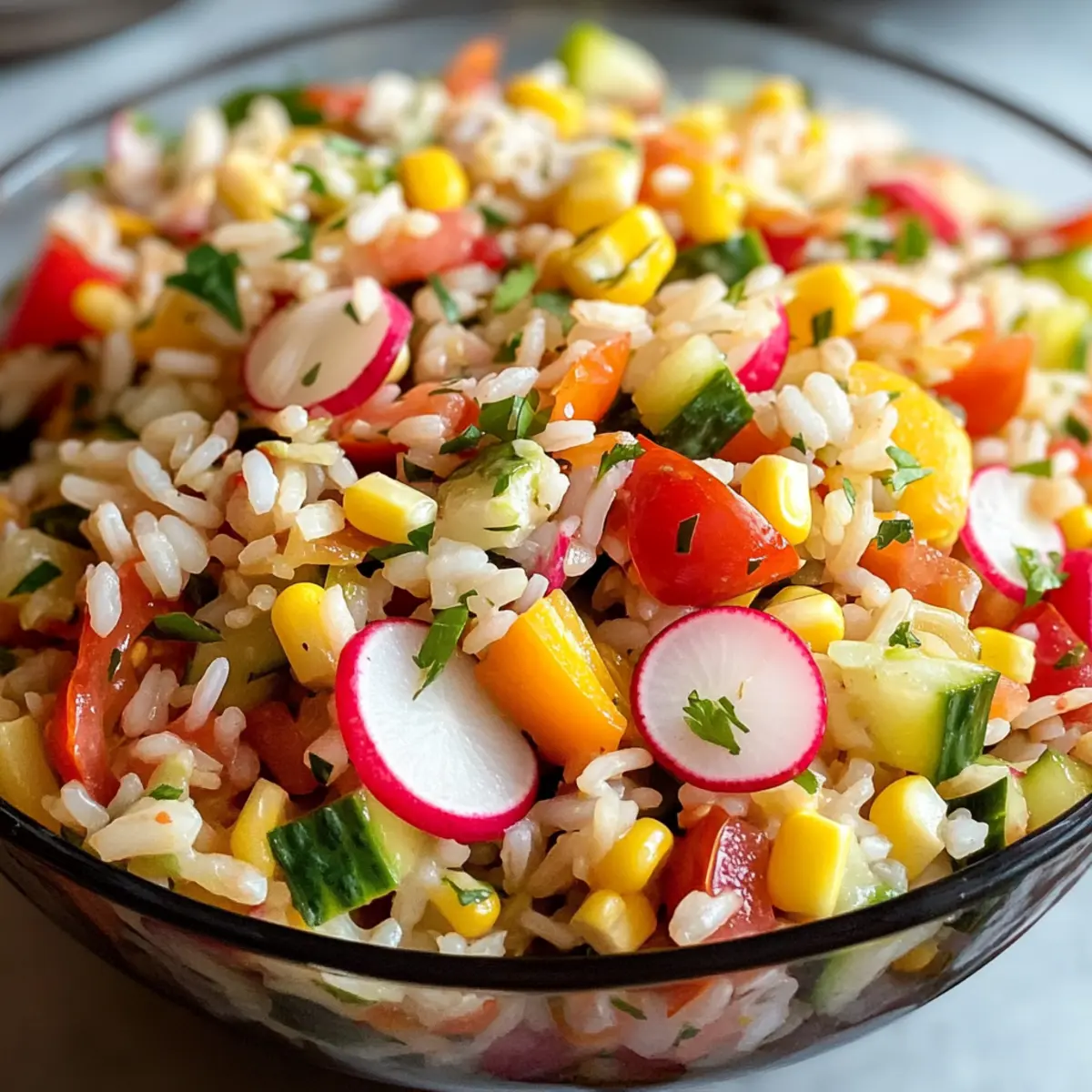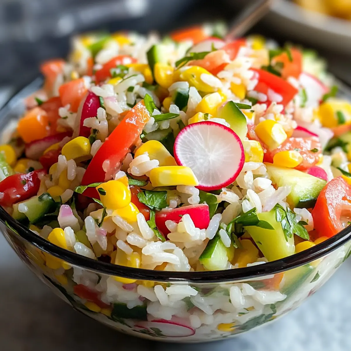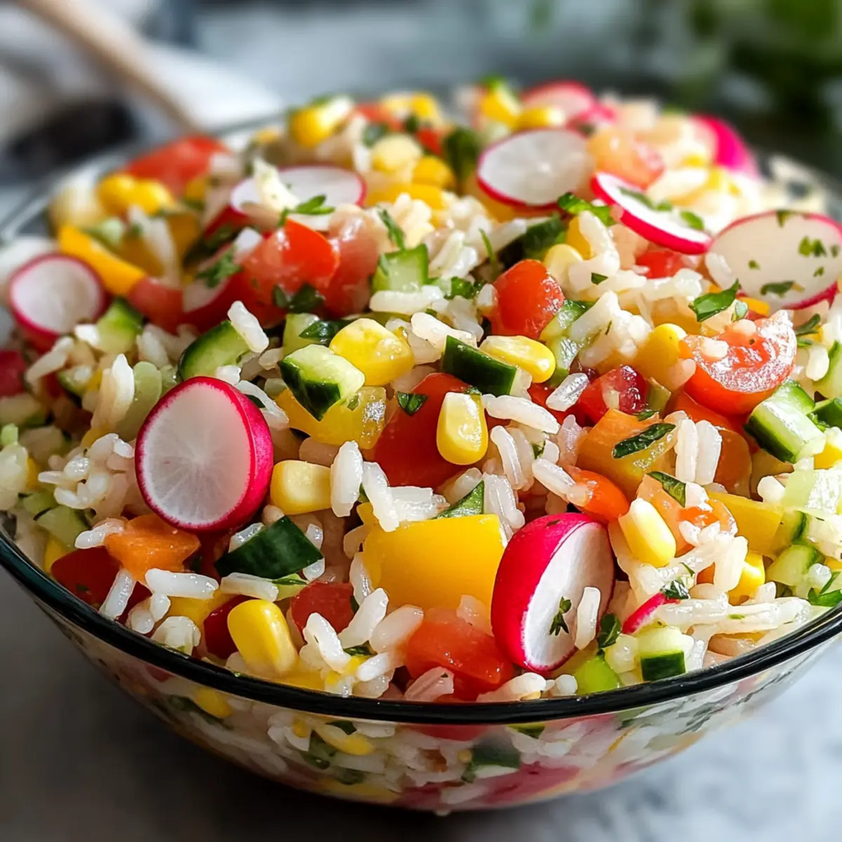 Gesunde Entscheidung: Reich an Vitaminen und Nährstoffen aus frischem Gemüse ist dieser Reissalat nicht nur lecker, sondern auch nahrhaft.