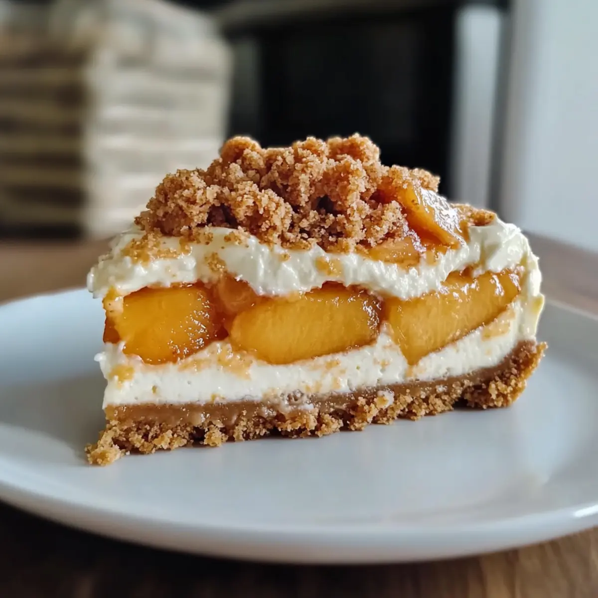 - Verteile die Hälfte der Käsemasse über die Kruste und die Hälfte der Pfirsichfüllung. Wiederhole mit der restlichen Masse.