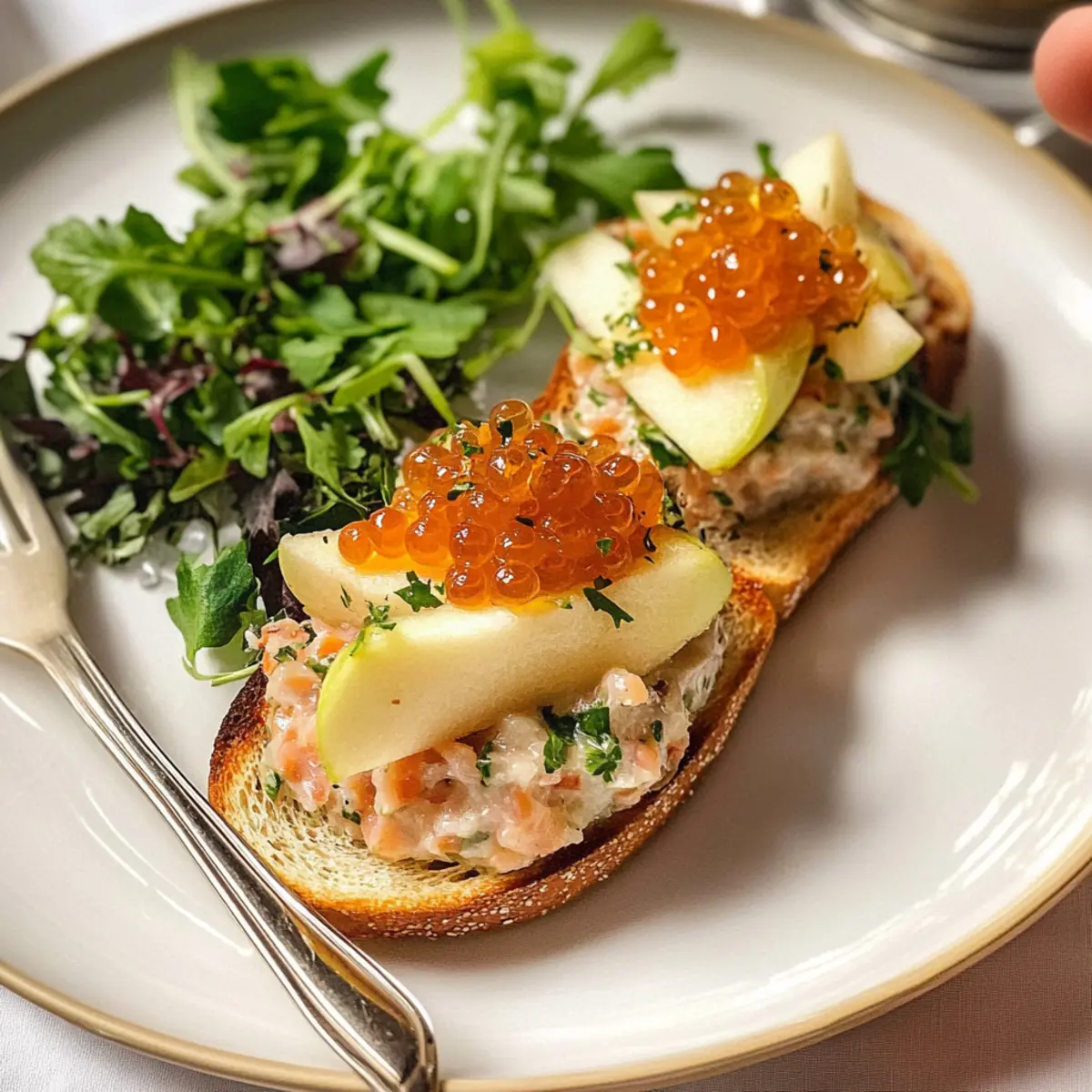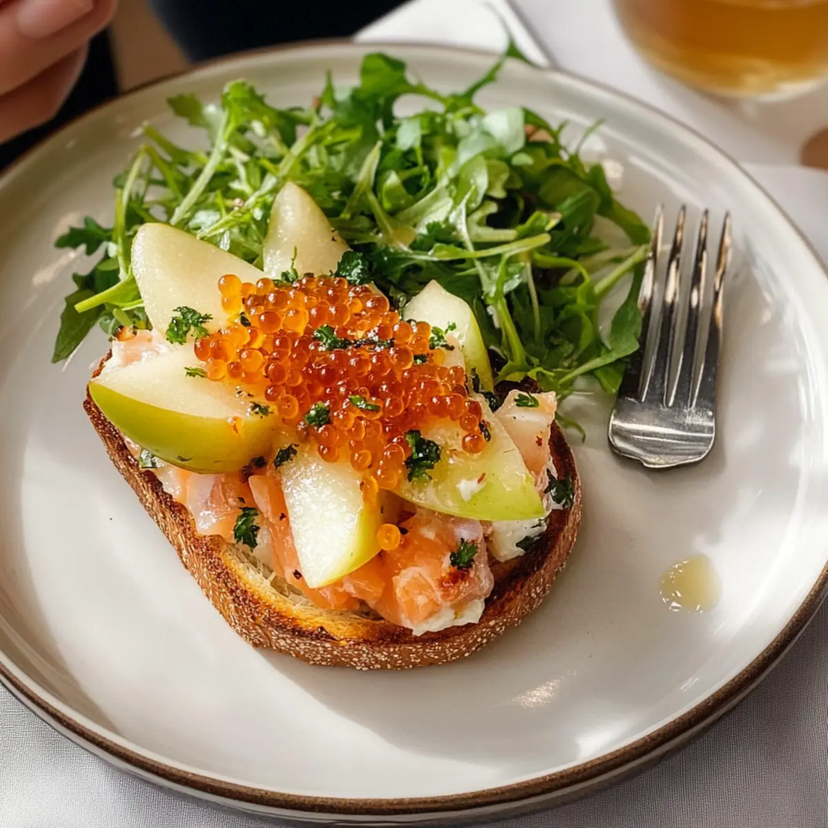 - Anrichten des Gerichts: Karamellisierte Apfelscheiben auf Toast legen, Räucherfischtatar darauf geben, mit Forellenkaviar und frischen Kräutern garnieren und sofort servieren.