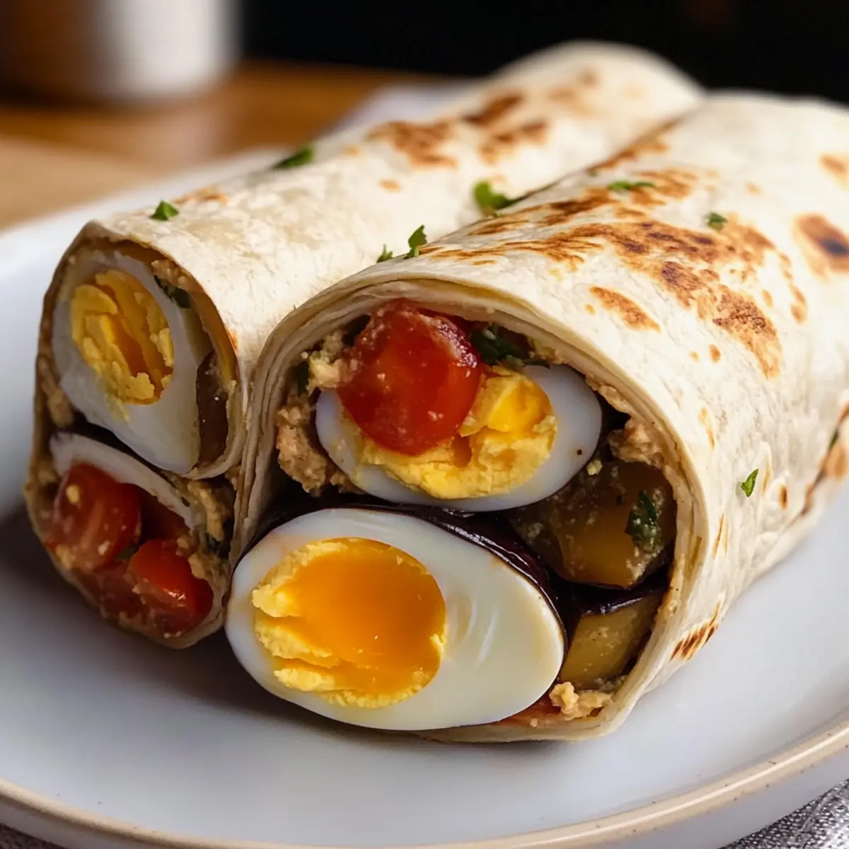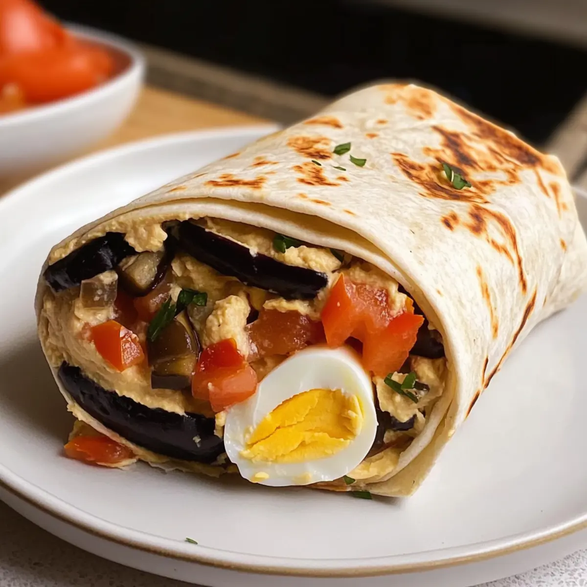 - Schichte die sautéierte Aubergine, die gewürfelte Tomate, die Zwiebelringe und die halbierten Eier auf den Wrap.