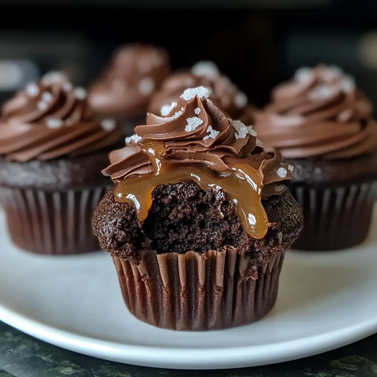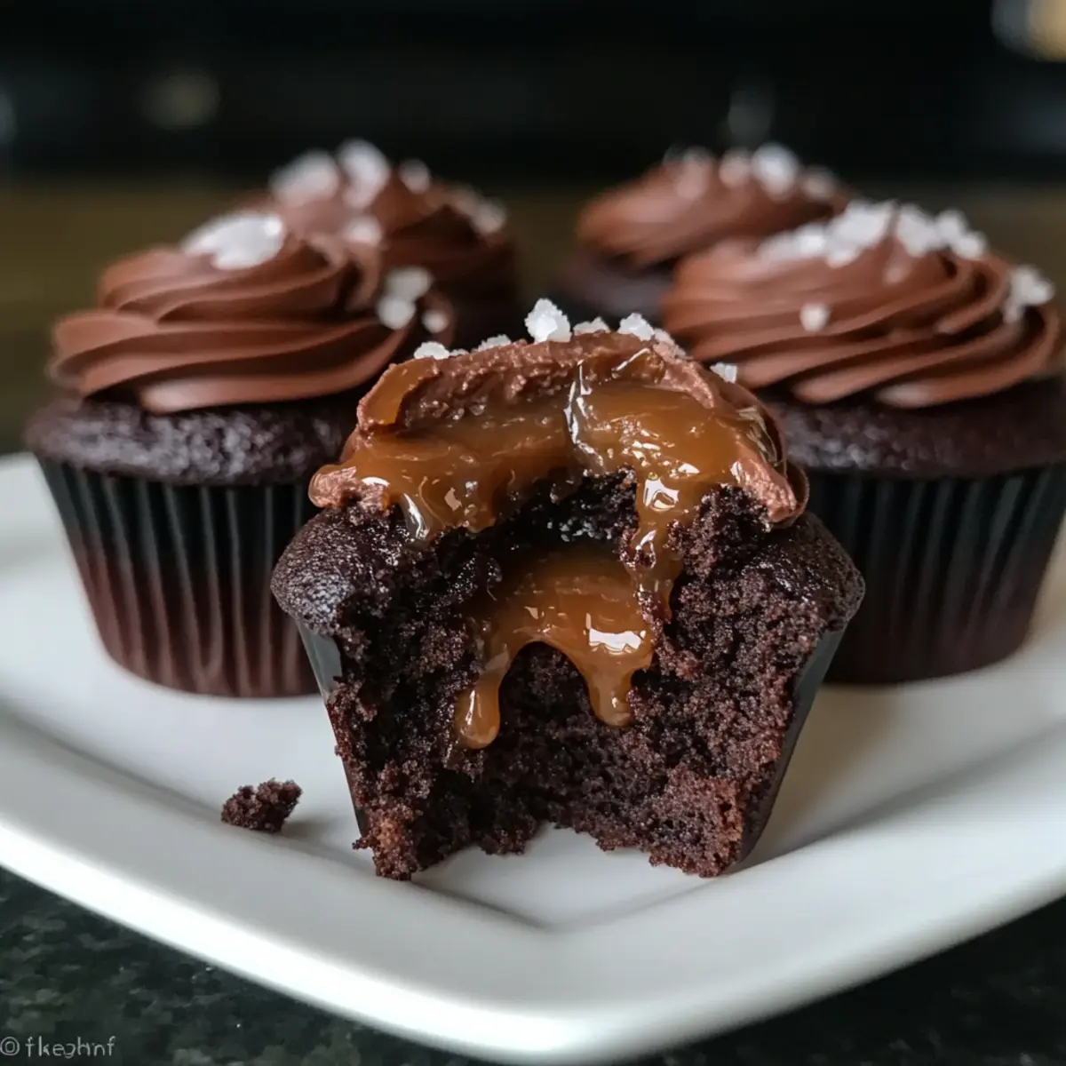 Garnieren nicht vergessen: Die Prise grobes Salz als Garnierung verbessert den Geschmack und sorgt für einen kontrastierenden Crunch, was deine Saftigen Schoko Karamell Cupcakes noch unwiderstehlicher macht.