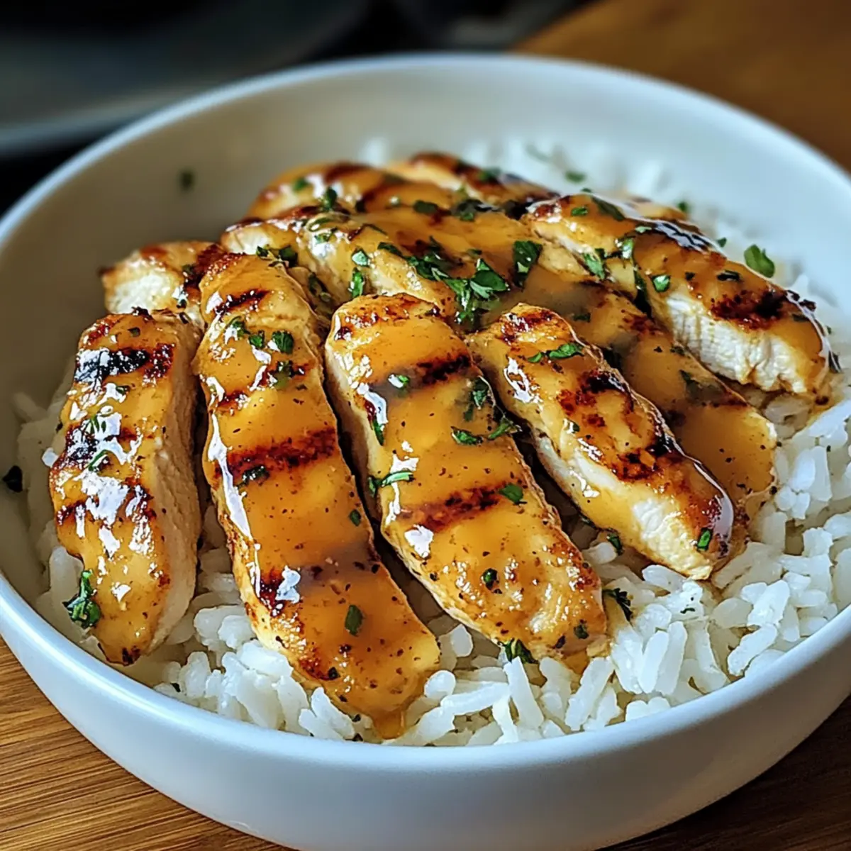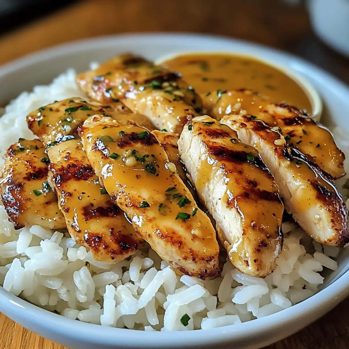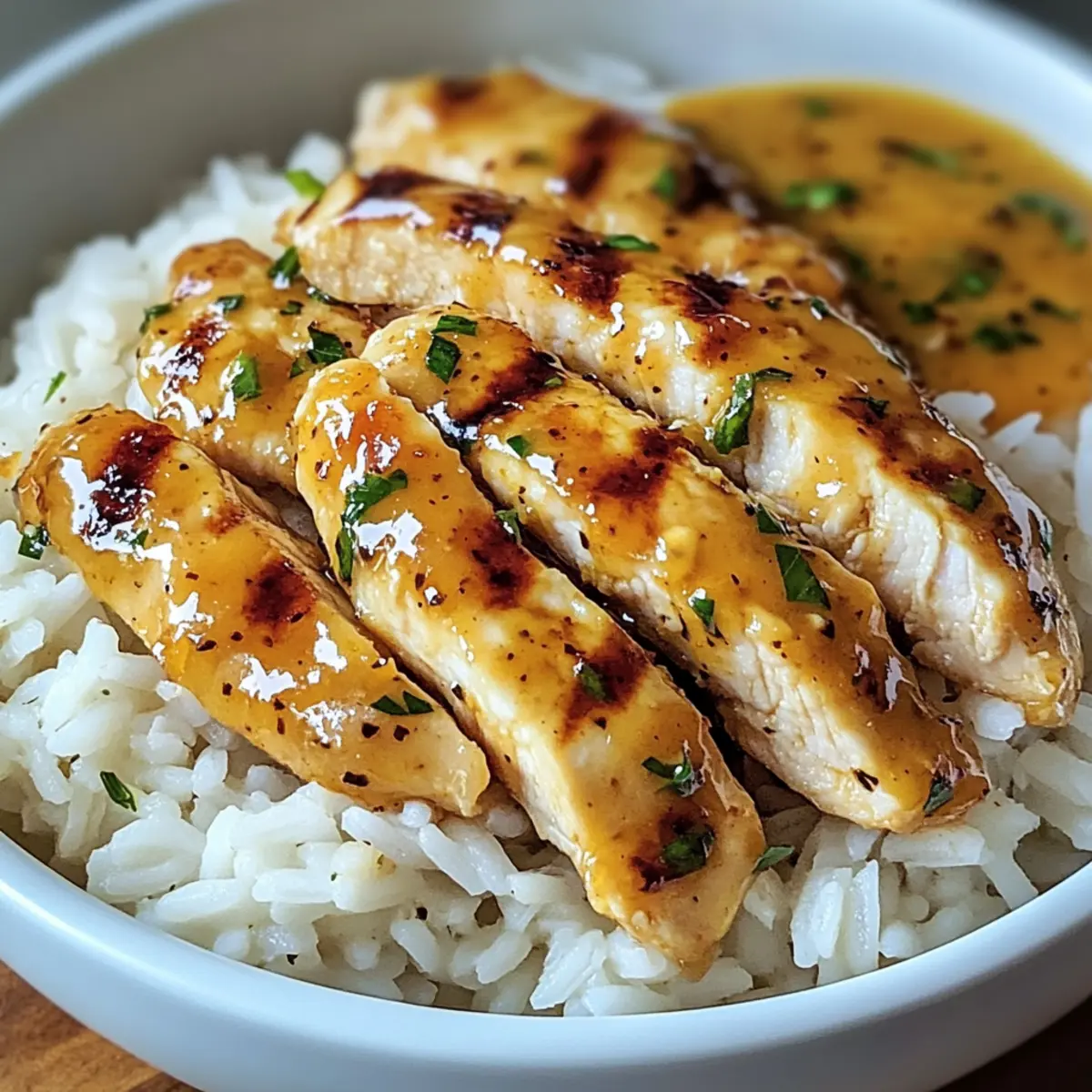 Richte das Schnelle Honig-Senf-Hähnchen mit der Sauce auf einer Portion Reis an. Optional kannst du das Gericht mit frisch gehackter Petersilie garnieren, um eine farbenfrohe Note hinzuzufügen. Die Kombination aus zartem Hähnchen und fluffigem Reis sorgt für ein leckeres, ausgewogenes Essen, das in kürzester Zeit serviert ist.