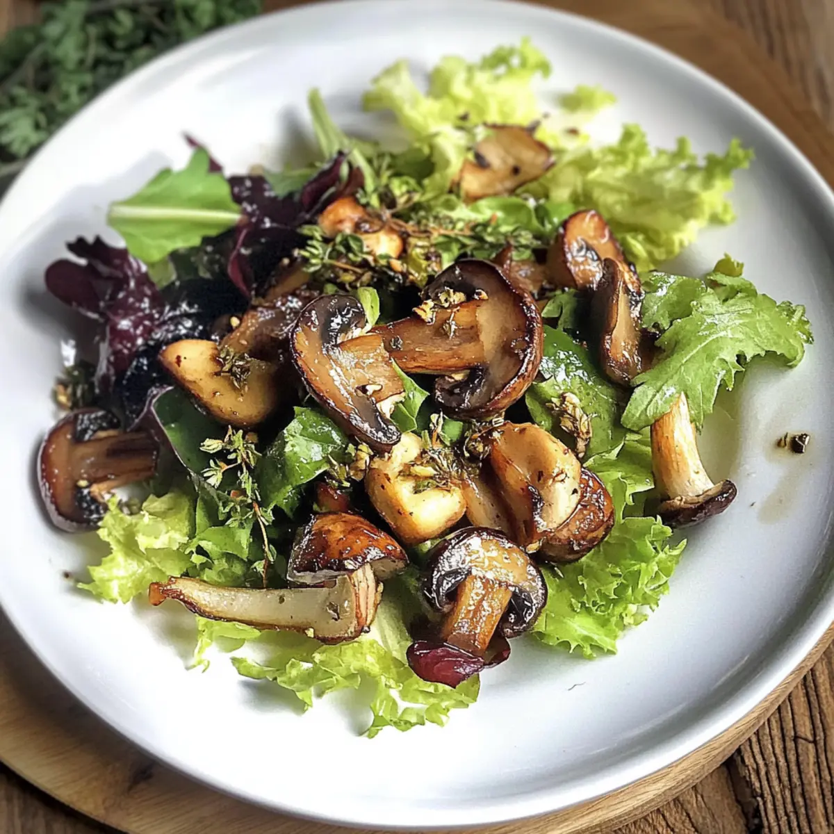 - Mische die frischen Salatblätter mit dem Dressing in einer großen Schüssel. Platiere den Salat dann auf einem Teller und lege die sautierten Pilze sowie die karamellisierten Schalotten darauf.