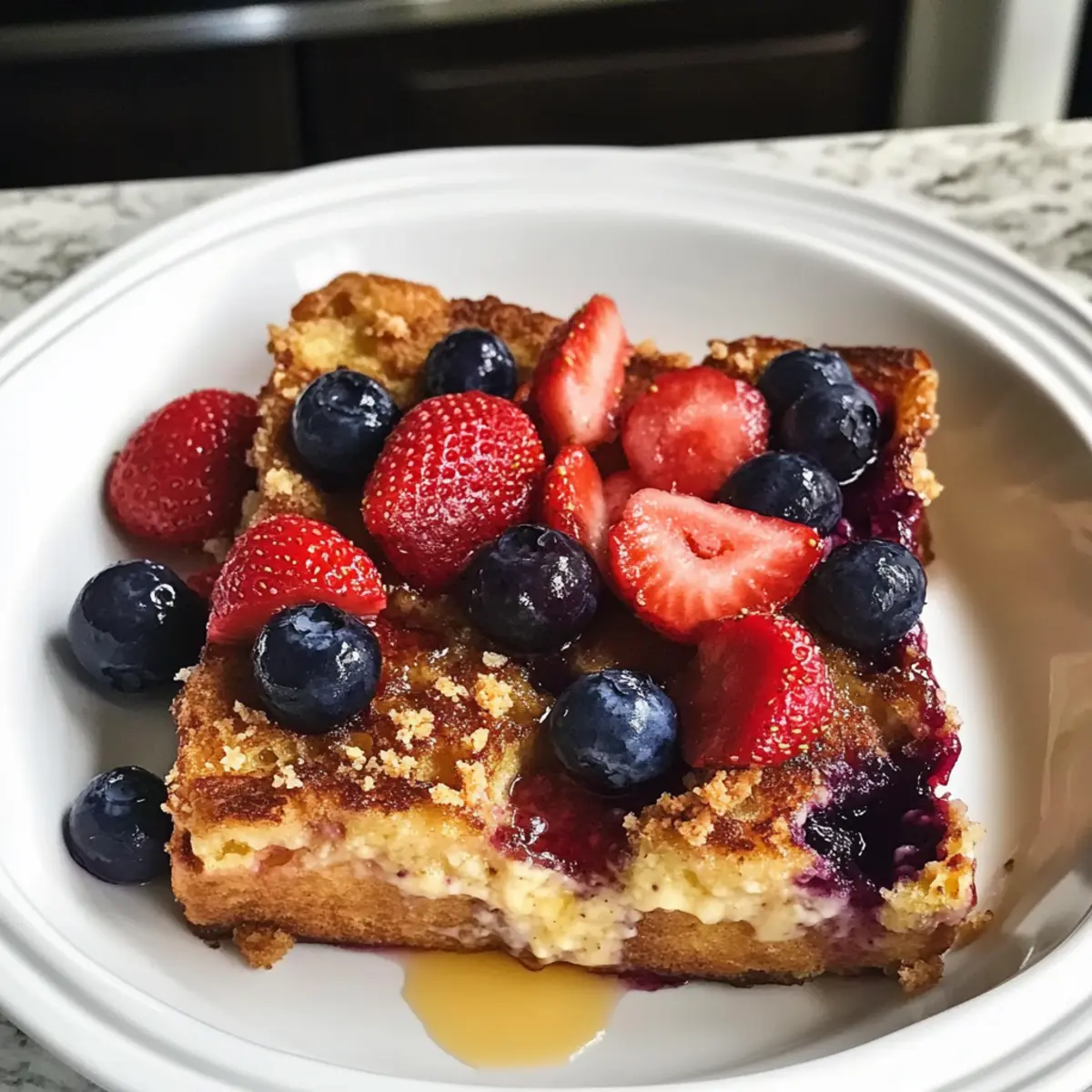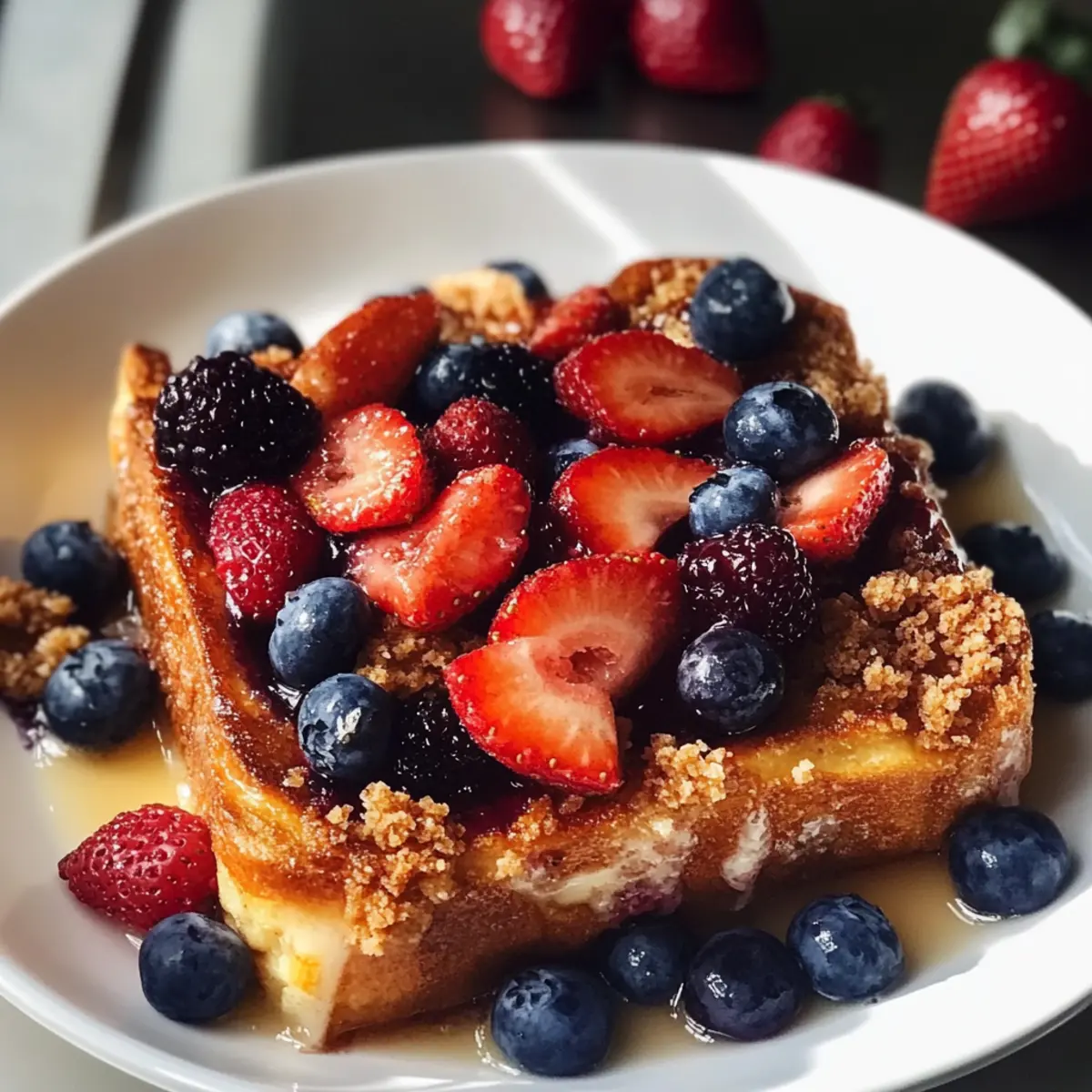 Heize den Ofen auf 180 °C vor. Nimm die Auflaufform aus dem Kühlschrank, entferne die Folie und verteile das Topping sowie die frischen Beeren gleichmäßig über den eingeweichten Brotwürfeln. Backe den Übernachtung French Toast für 50-60 Minuten, bis die Oberseite goldbraun ist und die Mitte fest aussieht. Ein leichtes Wackeln in der Mitte zeigt an, dass es noch etwas länger backen muss.