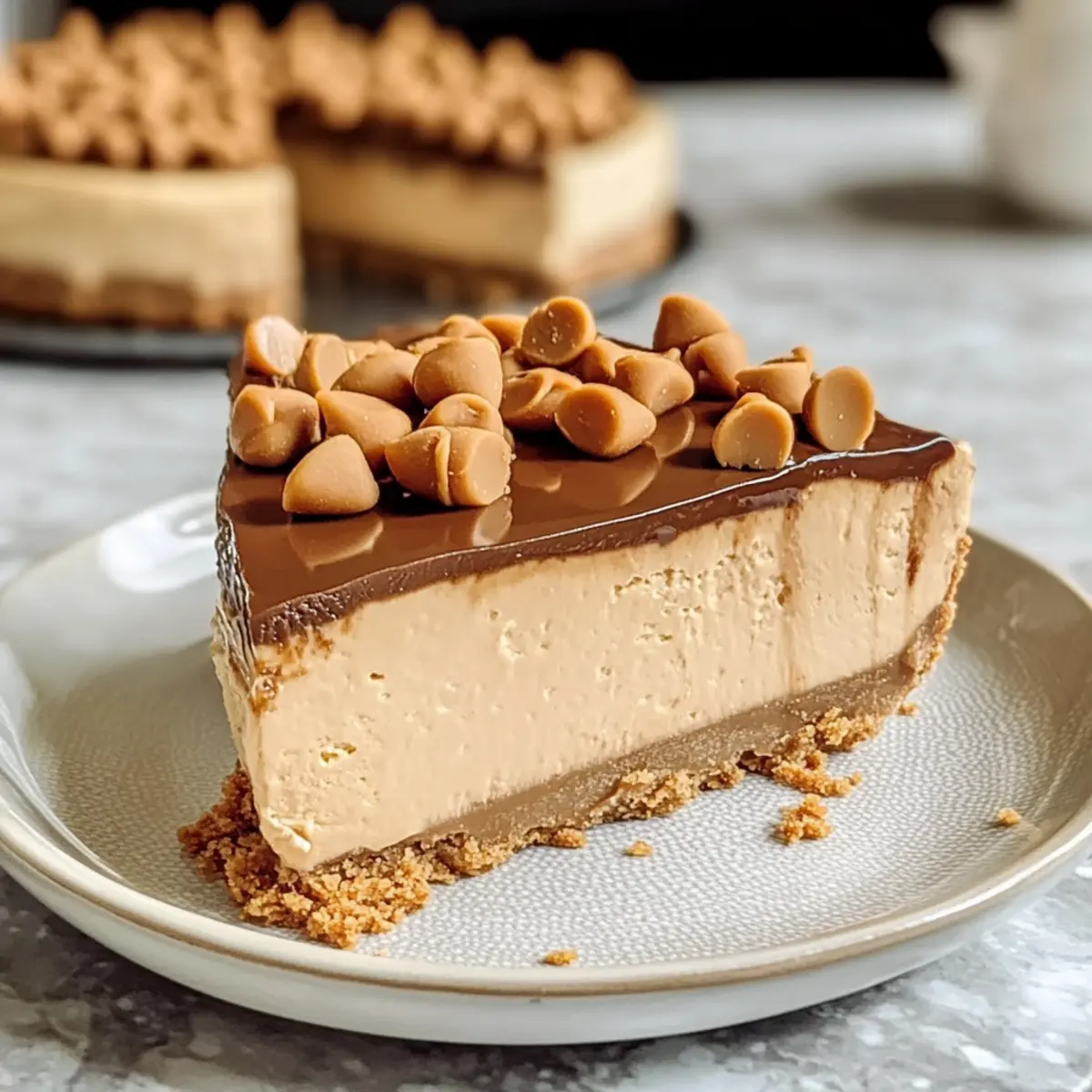 Schmelze die Butterscotch-Chips zusammen mit der schweren Sahne in der Mikrowelle, bis die Mischung glatt und glänzend ist. Gieße die Glasur über den gekühlten Käsekuchen und dekoriere ihn mit zusätzlichen Butterscotch-Chips. Lasse das Topping für 30 Minuten im Kühlschrank fest werden, bevor du ihn servierst.