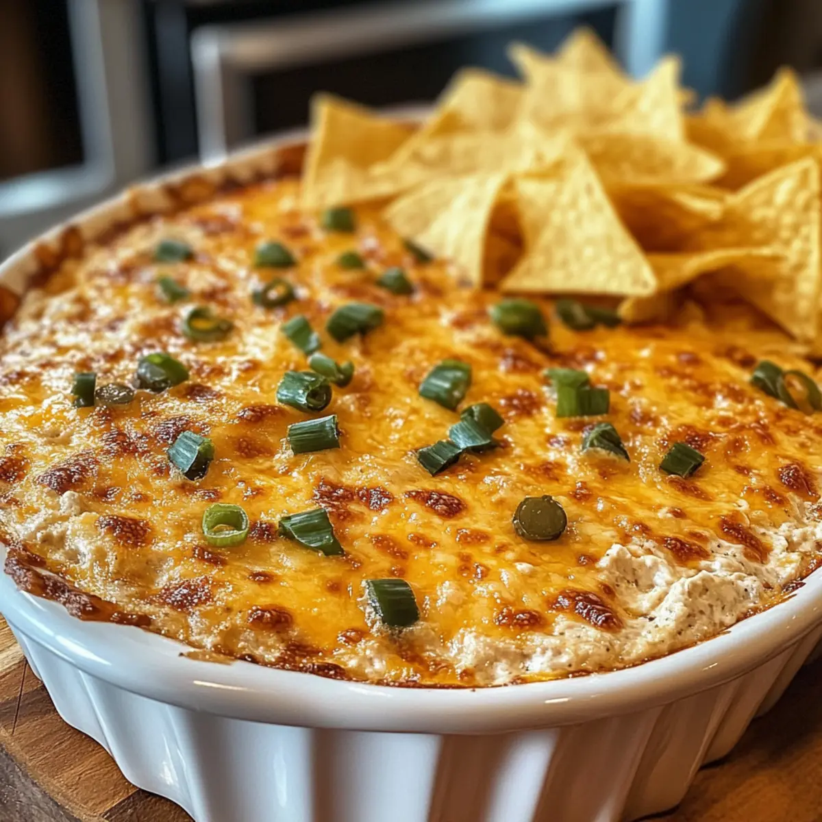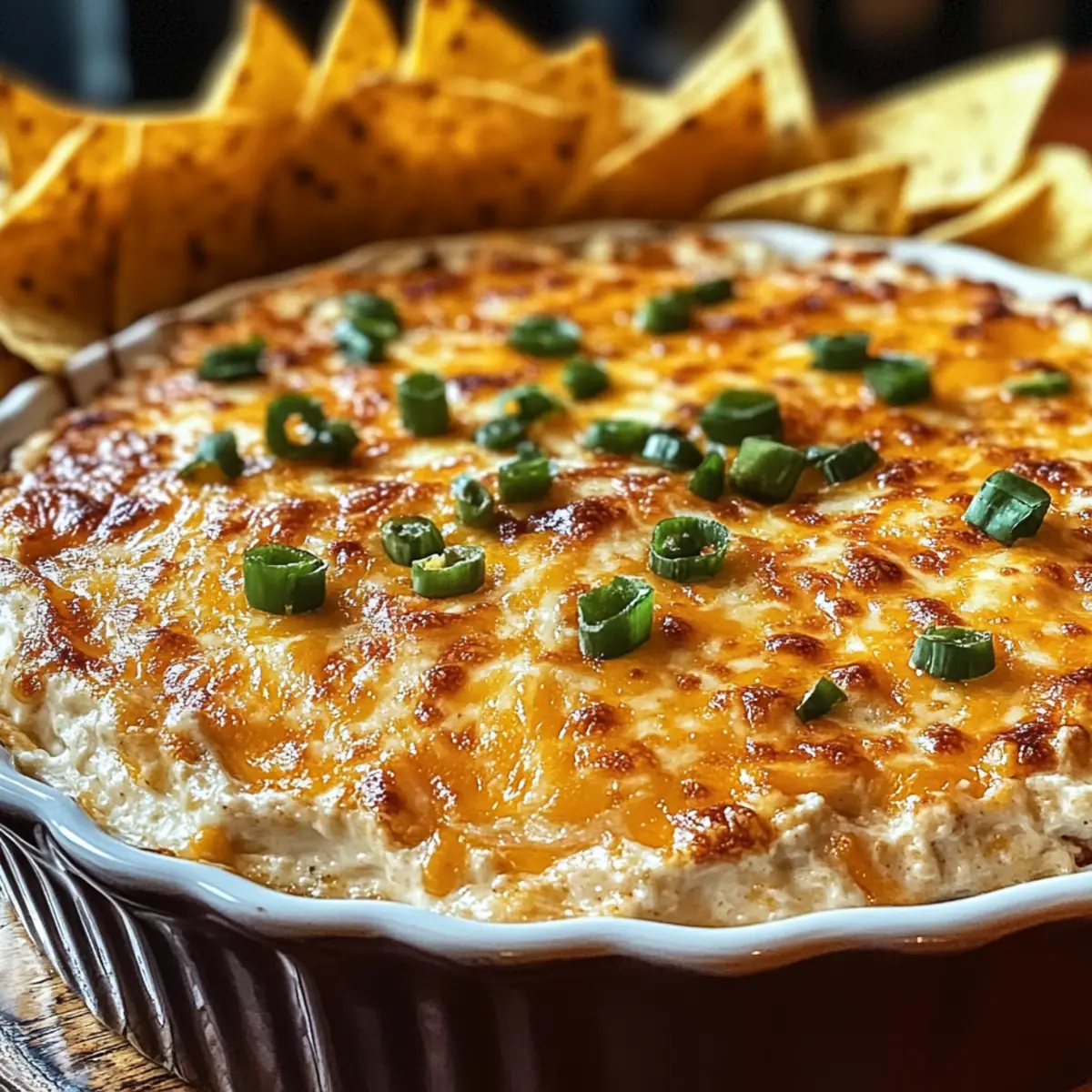 Beschreibe die Oberfläche mit zerbröseltem Speck und gehackten grünen Zwiebeln. Diese Toppings verleihen dem ultimativen würzigen käsigen gebackenen Fußball-Dip für Spieltag-Glück zusätzlichen Crunch und Geschmack. Sie sorgen auch für eine schöne Präsentation, wenn du den Dip servierst, damit er verführerischer aussieht.