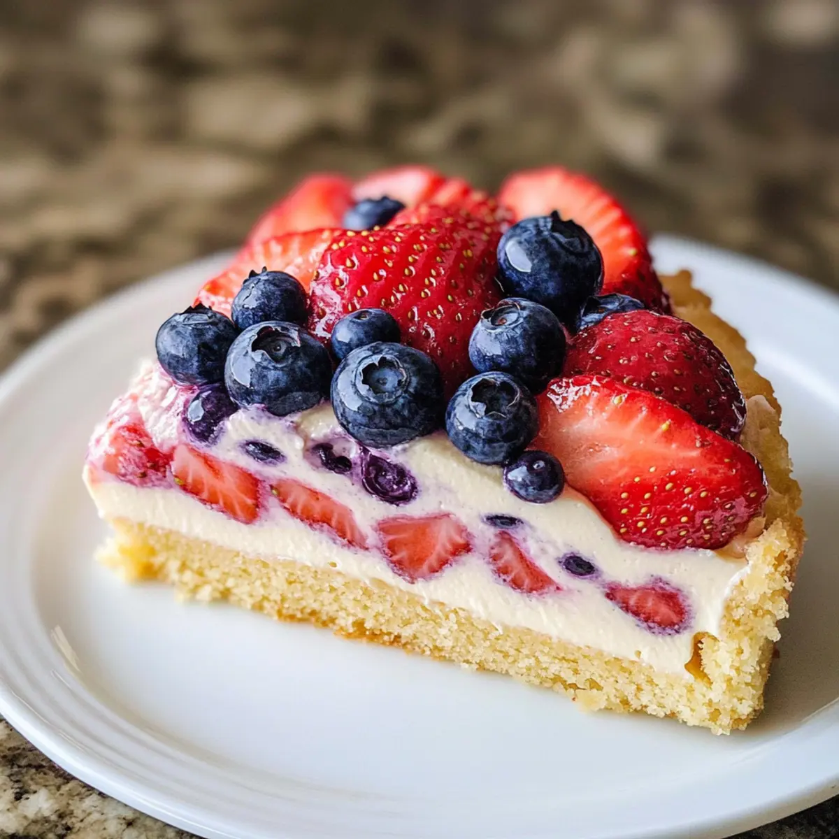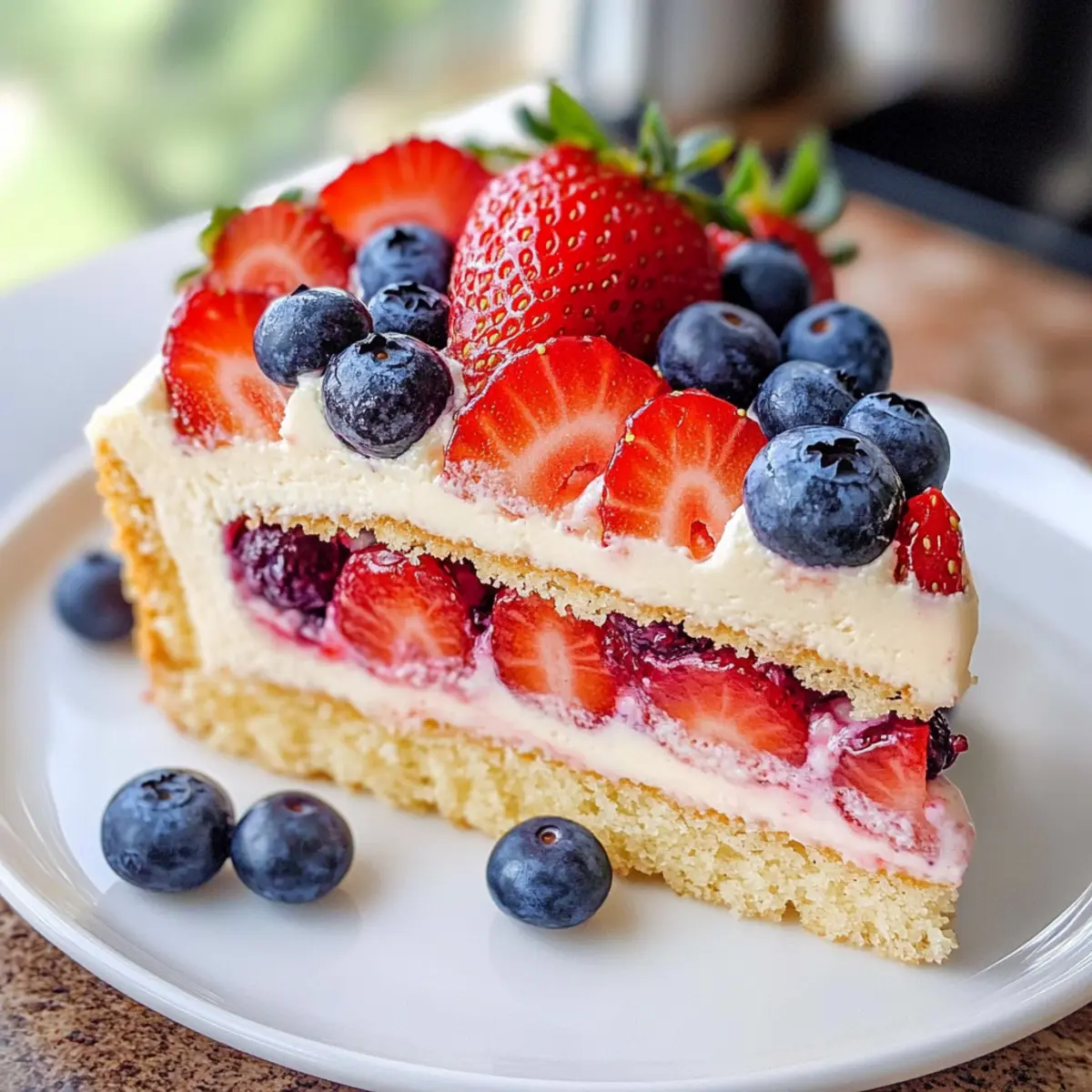 - Dekoriere den Kuchen mit halbierten Erdbeeren und ganzen Blaubeeren.