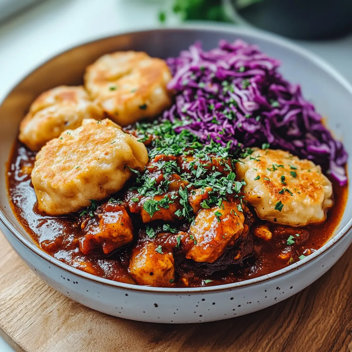 - Platziere das vegane Gulasch auf Tellern und füge die warmen Knödel sowie das Rotkraut hinzu. Garniere das Gericht nach Belieben mit frischer Petersilie.