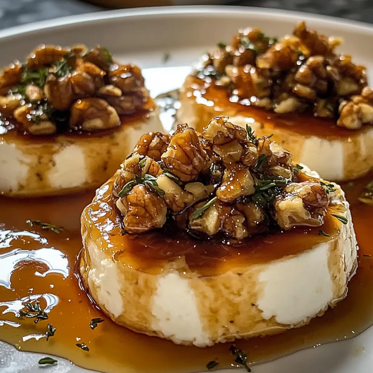 - Löffele die Walnuss-Glasur großzügig über die vorbereiteten Ziegenkäse-Scheiben und streue frischen Thymian darüber.